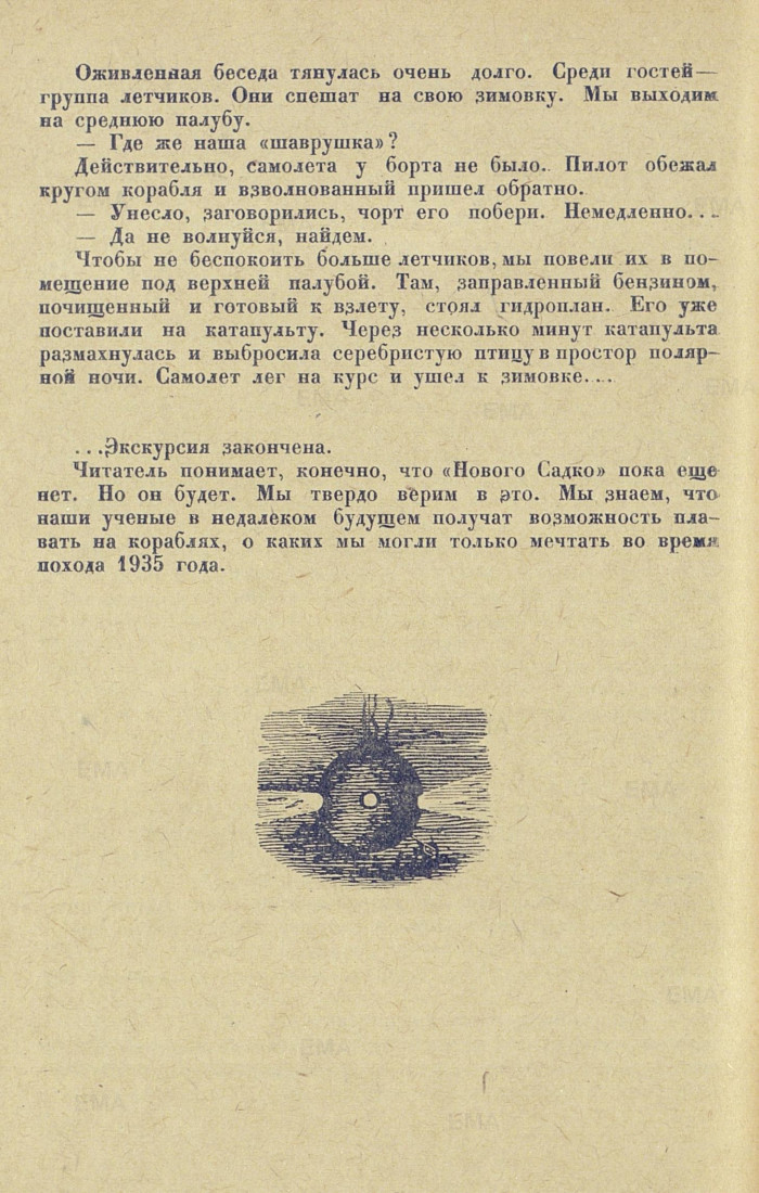 Чтобы не беспокоить больше летчиков, мы повели их в помещение под верхней палубой. Там, заправленный бензином, почищенный и готовый к взлету, стоял гидроплан. Его уже поставили на катапульту. Через несколько минут катапульта размахнулась и выбросила серебристую птицу в простор полярной ночи. Самолет лег на курс и ушел к зимовке....