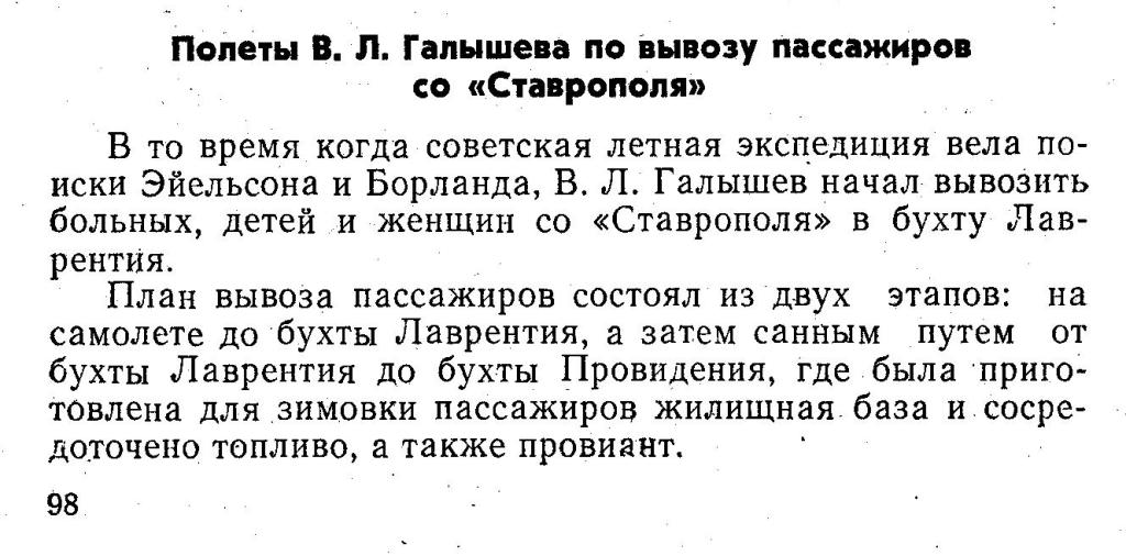 В то время когда советская летная экспедиция вела поиски Эйельсона и Борланда, В. Л. Галышев начал вывозить больных, детей и женщин со «Ставрополя» в бухту Лаврентия.