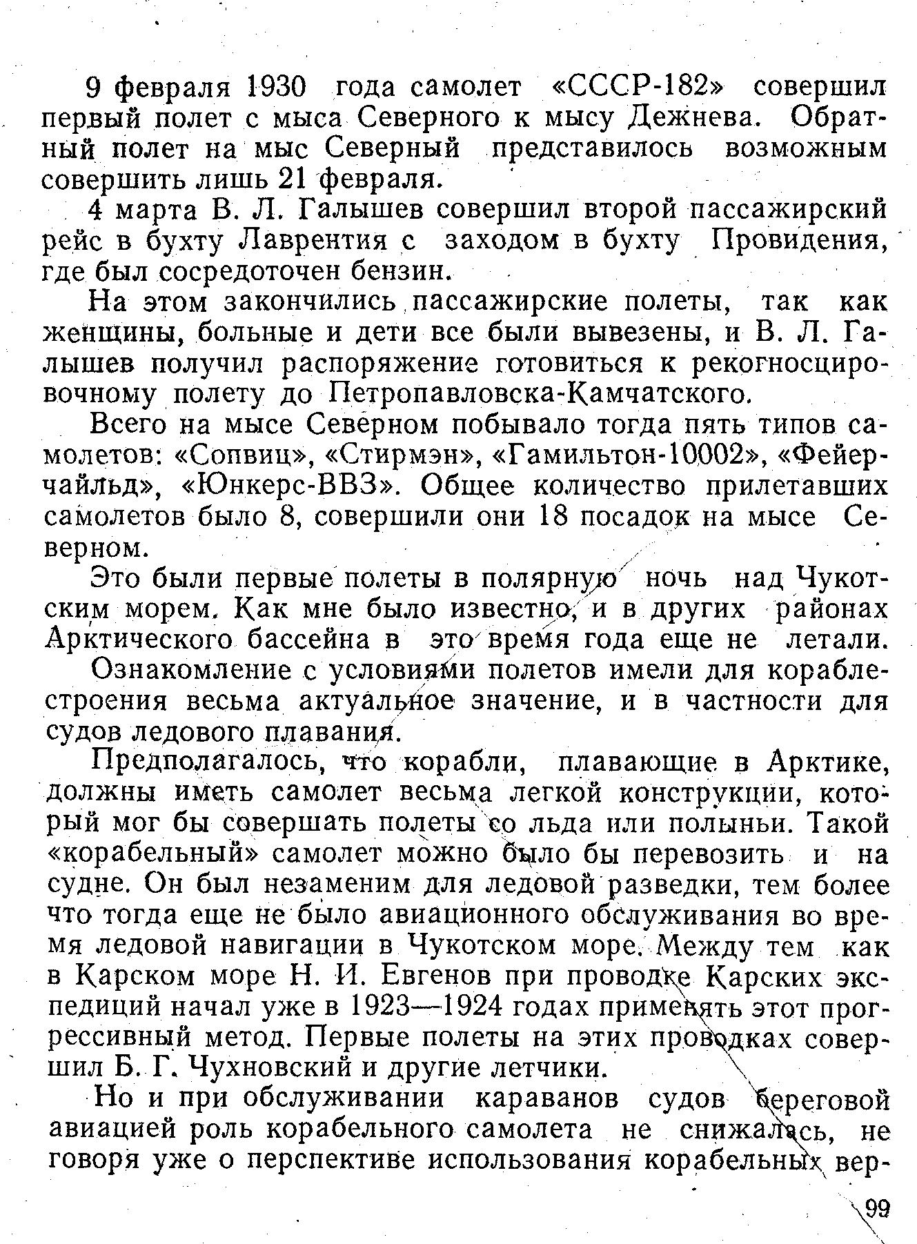 9 февраля 1930 года самолет «СССР-182» совершил первый полет с мыса Северного к мысу Дежнева. Обратный полет на мыс Северный представилось возможным совершить лишь 21 февраля.