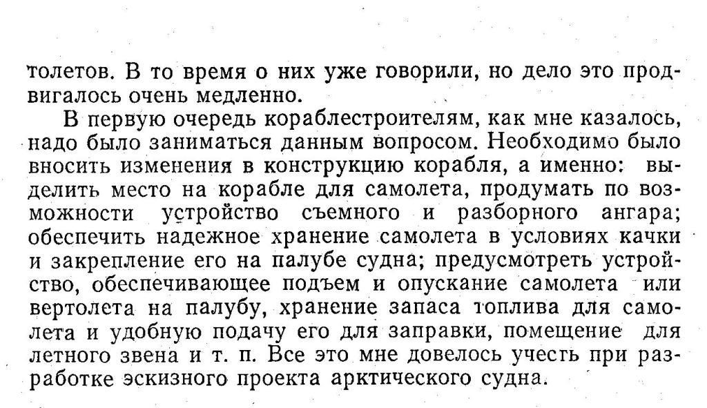 В первую очередь кораблестроителям, как мне казалось, надо было заниматься данным вопросом. Необходимо было вносить изменения в конструкцию корабля, а именно: выделить место на корабле для самолета, продумать по возможности устройство съемного и разборного ангара; обеспечить надежное хранение самолета в условиях качки и закрепление его на палубе судна; предусмотреть устройство, обеспечивающее подъем и опускание самолета или вертолета на палубу, хранение запаса топлива для самолета и удобную подачу его для заправки, помещение для летного звена и т. п. Все это мне довелось учесть при разработке эскизного проекта арктического судна.