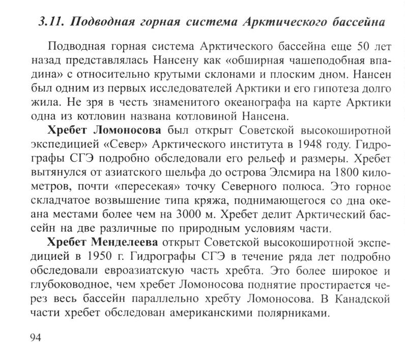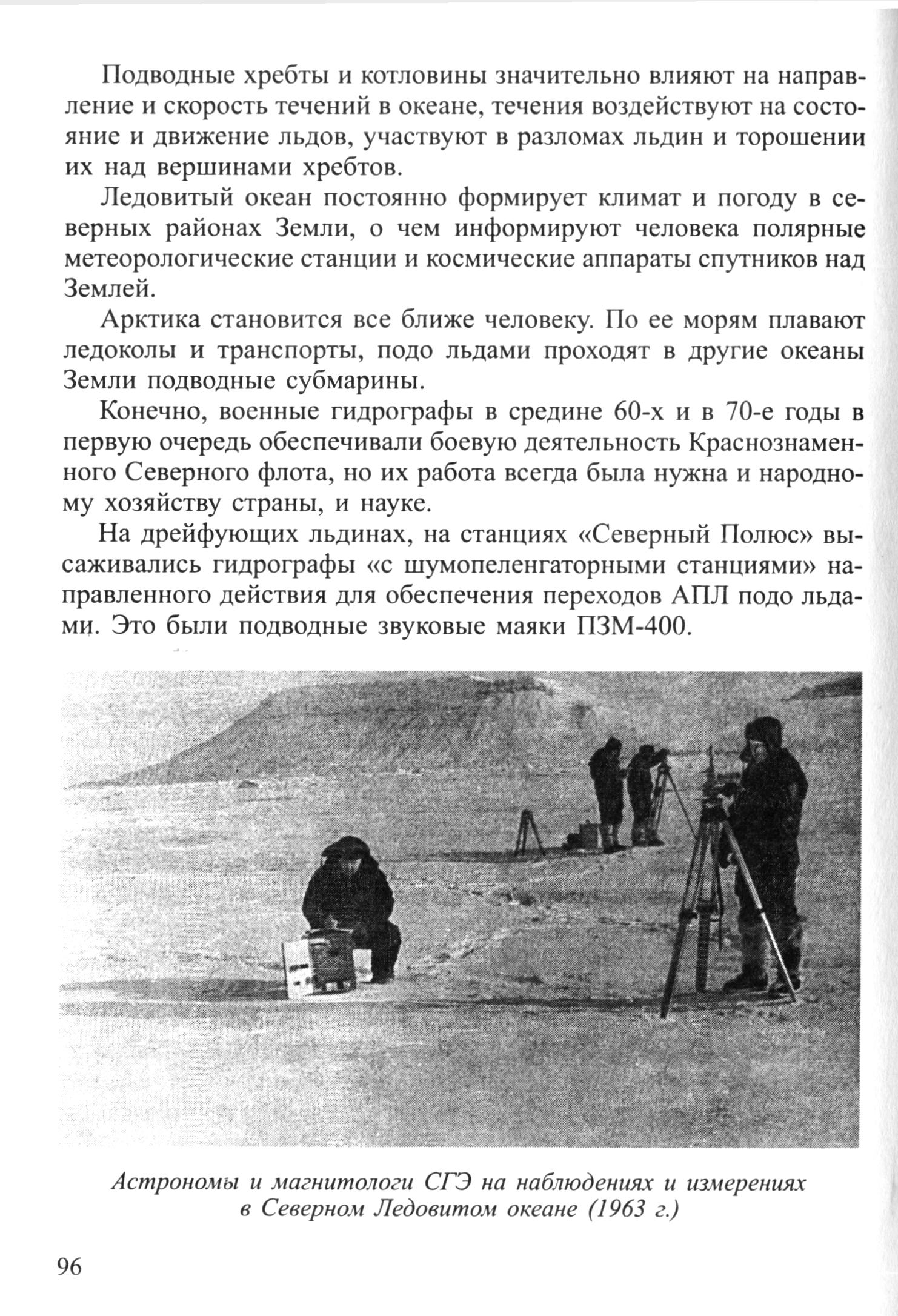 Под дрейфующими льдами и толщей океанской воды лежит огромная горная страна, в которой многолетним героическим трудом гидрографов-нсследователей, ученых-полярников, отважных авиаторов открыты и увековечены названиями: могучий порог Ломоносова, поднятие Менделеева, хребет Гаккеля, Чукотский купол; глубокие котловины — Макарова, Нансена, Амундсена, Канадская, Подводников; долина Гидрографов и порог Геофизиков.Исследования советских гидрографов в Арктическом бассейне не только открыли дороги для безопасного плавания, их результаты послужили основой для научных гипотез о происхождении Северного Ледовитого океана, его геологического строения и тектоники.