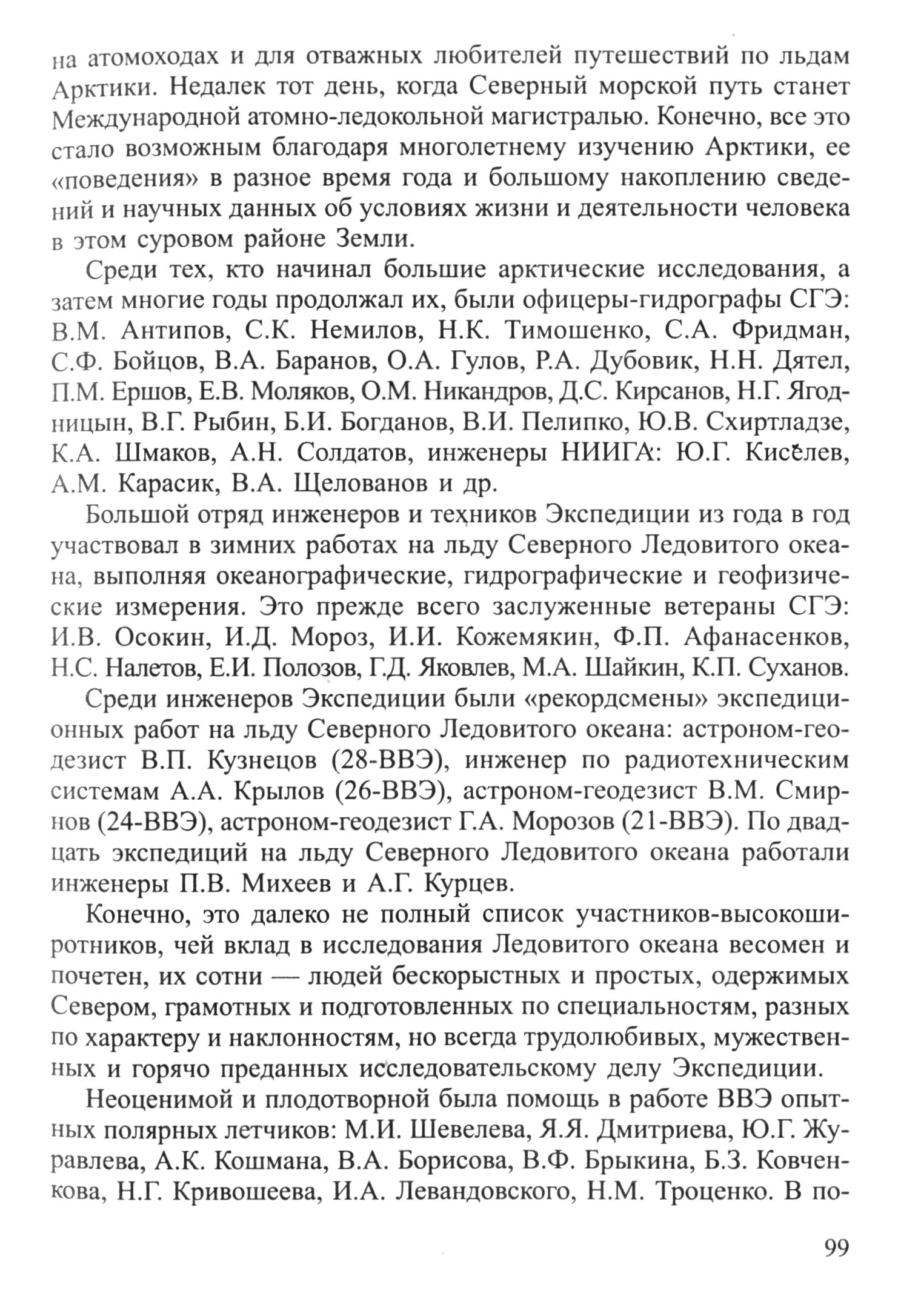 Среди тех, кто начинал большие арктические исследования, а затем многие годы продолжал их, были офицеры-гидрографы СГЭ: B. М. Антипов, С. К. Немилов, Н. К. Тимошенко, С. А. Фридман, C. Ф. Бойцов, В. А. Баранов, О. А. Гулов, Р. А. Дубовик, Н. Н. Дятел, П. М. Ершов, Е. В. Моляков, О. М. Никандров, Д. С. Кирсанов, Н. Г. Ягодницын, В. Г. Рыбин, Б. И. Богданов, В. И. Пелипко, Ю. В. Схиртладзе, К. А. Шмаков, А. Н. Солдатов, инженеры НИИГА: Ю. Г. Киселев, А. М. Карасик, В. А. Щелованов и др.