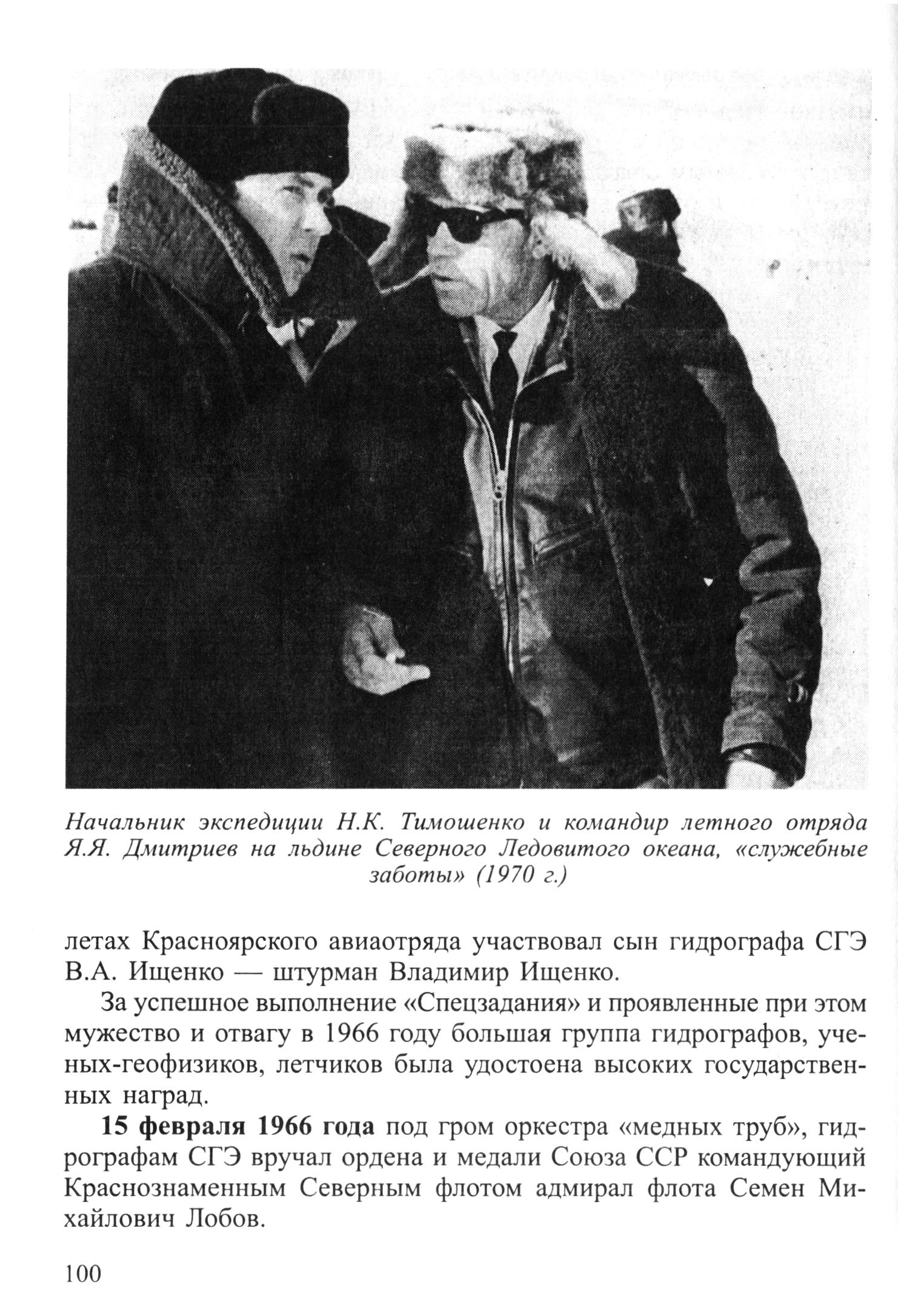 Начальник экспедиции Н. К. Тимошенко и командир летного отряда Я. Я. Дмитриев на льдине Северного Ледовитого океана, «служебные заботы» (1970 г.)летах Красноярского авиаотряда участвовал сын гидрографа СГЭ В. А. Ищенко — штурман Владимир Ищенко.
