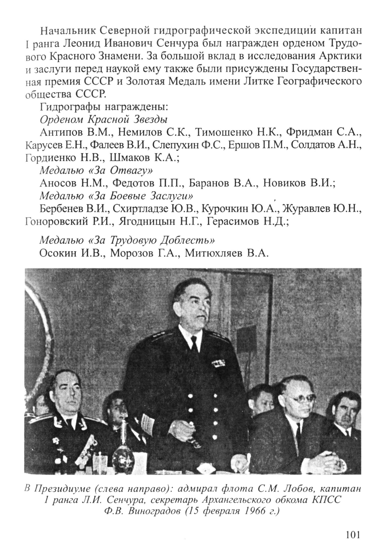 В Президиуме (слева направо): адмирал флота С. М. Лобов, капитан 1 ранга Л. И. Сенчура, секретарь Архангельского обкома КПСС Ф. В. Виноградов (15 февраля 1966 г.)[101]