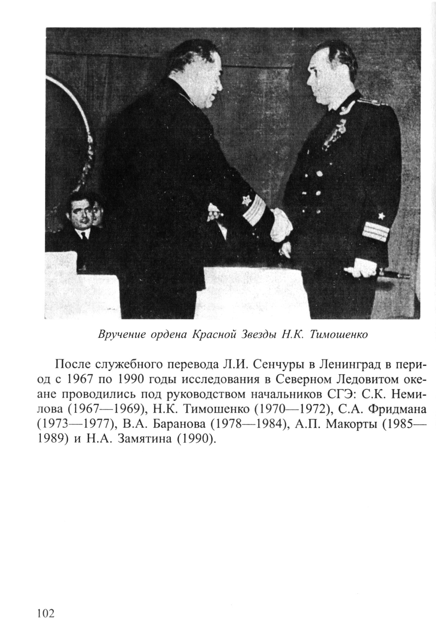 Вручение ордена Красной Звезды Н. К. ТамошенкоПосле служебного перевода Л. И. Сенчуры в Ленинград в период с 1967 по 1990 годы исследования в Северном Ледовитом океане проводились под руководством начальников СГЭ: С. К. Немилова (1967—1969), Н. К. Тимошенко (1970—1972), С. А. Фридмана (1973—1977), В. А. Баранова (1978—1984), А. П. Макорты (1985—1989) и Н. А. Замятина (1990).
