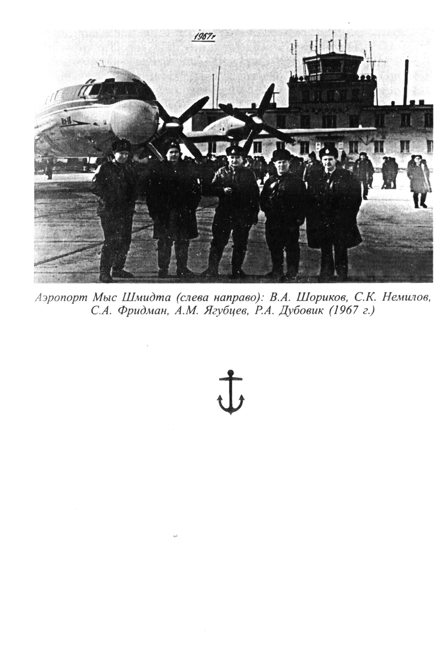 Аэропорт Мыс Шмидта (слева направо): В. А. Шориков, С. К. Немилов, С. А. Фридман, А. М. Ягубцев, Р. А. Дубовик (1967 г.)[103]