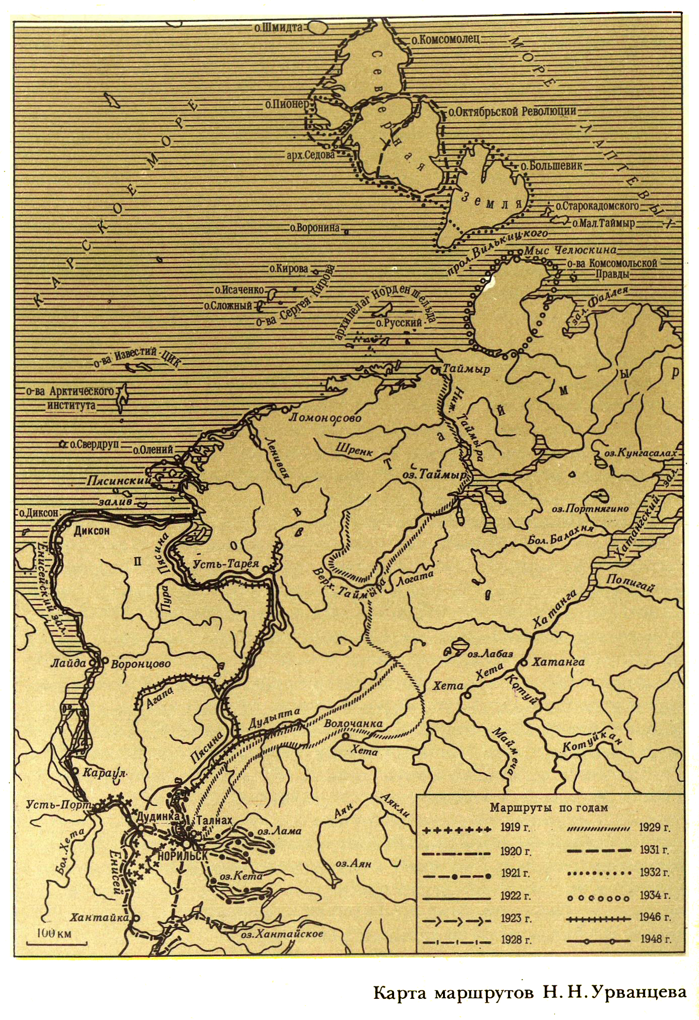 По вечерам в темную пору, когда нельзя было выезжать, обстоятельно обсуждали все детали предстоящих маршрутов. Наша осенняя поездка показала, что Северная Земля должна состоять по крайней мере из трех островов, разделенных проливами. Нам следовало объехать кругом, заснять отдельно и пересечь каждый остров. На один маршрут придется от 500 до 1000 километров. Каждый маршрут с учетом остановки для осмотра и съемки займет не менее месяца. Упряжке из 10 собак на это время потребуется 150 килограммов пеммикана, нам — 40 килограммов. Снаряжение, инструменты и прочее составят еще 100 килограммов. Таким образом, общая нагрузка на нарты с учетом веса нарт и человека достигнет 430 килограммов. Известно, что нормальная ездовая собака может тянуть более или менее продолжительное время груз, равный своему весу. Собаки у нас были большей частью некрупные, весом около 35 килограммов. Таким образом, упряжка потянет около 350 килограммов. Чтобы избежать перегрузки, придется запас пеммикана уменьшить и создать на пути промежуточные продовольственные склады, тем более что маршруты из-за непогоды и других обстоятельств могли длиться более месяца. Основное депо уже было заложено на мысе Серпа и Молота.