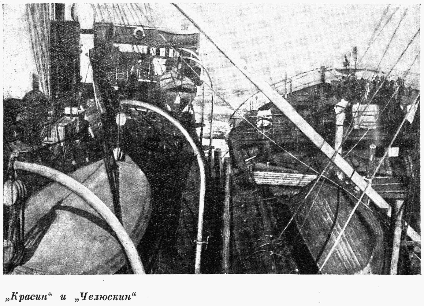 "Красин" в этом году должен был находиться в центре пути, близ мыса Челюскина, имея основным заданием проводку трех грузовых пароходов к устью Лены. Для обеспечения этой совместной операции "Челюскин" брал с собой добавочный уголь (около тысячи тонн) для "Красина". Перед выходом экспедиции я в качестве ее начальника сообщил сотруднику "Правды" следующее ("Правда" от 9 июля 1933 года):