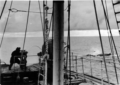 На плавбазе слышали хриплые хлопки гарпунных пушек, с нетерпением ждали сообщения по трансляции. Сменившиеся с вахт сообщения не дождались, с тем и легли. Радио сообщило об охотничьем почине в пятом часу утра 28 января 1947 года. Первого финвала длиной 19,7 метров добыл норвежский гарпунер Ольсен с охотника "Слава-4" к северо-западу от острова Буве. Когда охотник гордо подводил тушу к корме, высыпали на палубу. Флагман дал крен, на борту, как никак, 370 любопытных. Большинство не видели не только китов, но и бамбука, флагшток флага, полоскавшегося над тушей, был из бамбука. Поверили в себя и в возможности охотников, способных на форсированном ходу почти бесшумно, благодаря паровой машине, подкрадываться к китам, разворачиваться "на пятке". Судовое радио на флагмане взахлеб трезвонило о добычах.