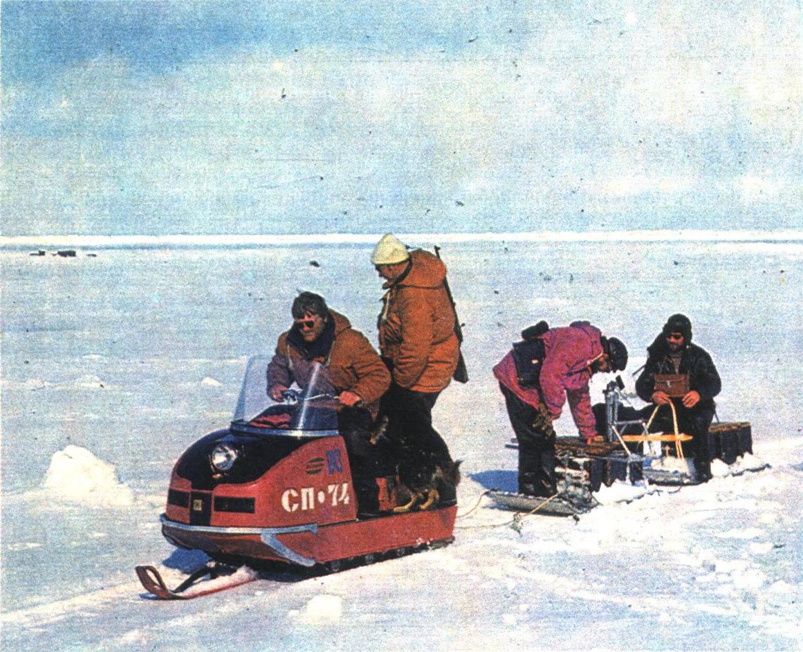 Ранней весной 1974 г. группа, состоявшая из сотрудников Арктического и антарктического научно-исследовательского института, вылетела на дрейфующую станцию «Северный полюс-22». Одним из разделов программы научных исследований предусматривалось проведение наледных и подводных наблюдений за строением ледяного покрова в точках, удаленных от основного лагеря станции на расстояние до 3—4 километров. Для обеспечения этих наблюдений единодушно был избран снегоход «Буран». На капоте одного из них надпись «СП-74». Оказывается, завод готовил эту машину для экспедиции газеты «Комсомольская правда», собиравшейся весной 1974 г. совершить поход к Северному полюсу. Но попала она в центр Арктического бассейна быстрее и проще: на самолете Ил-14.