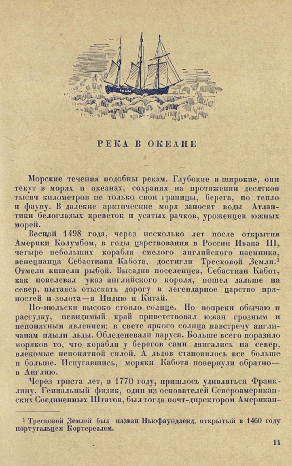РЕКА В ОКЕАНЕМорские течения подобны рекам. Глубокие и широкие, они текут в морях и океанах, сохраняя на протяжении десятков тысяч километров не только свои границы, берега, по тепло и фауну. В далекие арктические моря заносят воды Атлантики белоглазых креветок и усатых рачков, уроженцев южных морей.