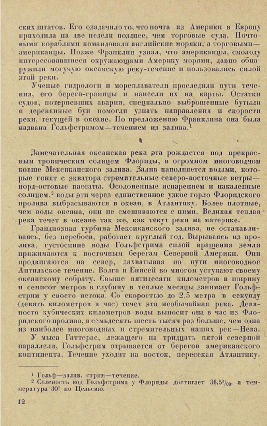 1 Гольф — залив, стрим — течение.2 Соленость вод Гольфстрима у Флориды достигает З6,5 ‰, а температура 30° по Цельсию.[12]
