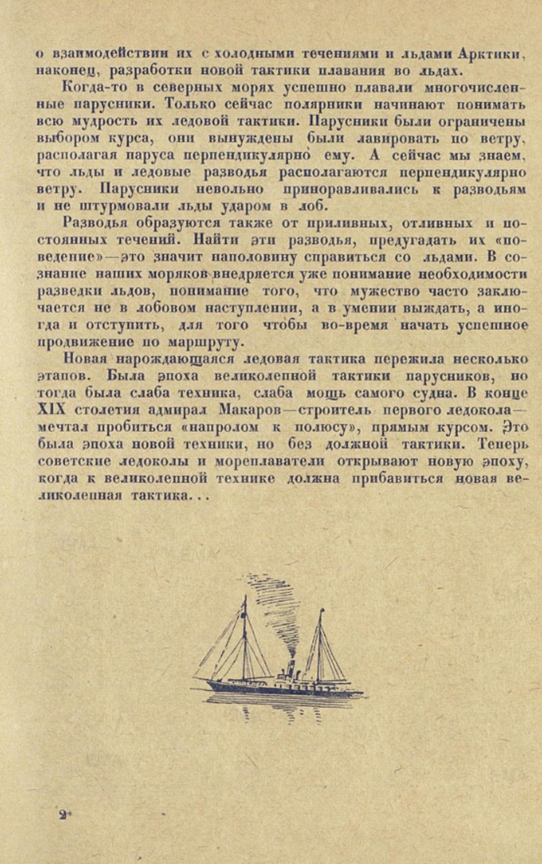 Новая нарождающаяся ледовая тактика пережила несколько этапов. Была эпоха великолепной тактики парусников, по тогда была слаба техника, слаба мощь самого судна. В конце XIX столетня адмирал Макаров—строитель первого ледокола — мечтал пробиться «напролом к полюсу», прямым курсом. Это была эпоха повой техники, но без должной тактики. Теперь советские ледоколы и мореплаватели открывают новую эпоху, когда к великолепной технике должна прибавиться новая великолепная тактика...