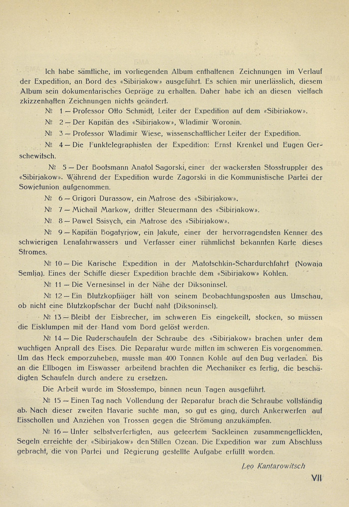 Ich habe sämtliche, im vorliegenden Album enthaltenen Zeichnungen im Verlauf der Expedition, an Bord des «Sibirjakow» ausgeführt. Cs schien mir unerlässlich, diesem Album sein dokumentarisches Gepräge zu erhalten. Daher habe ich an diesen vielfach zkizzenhaften Zeichnungen nichts geändert.