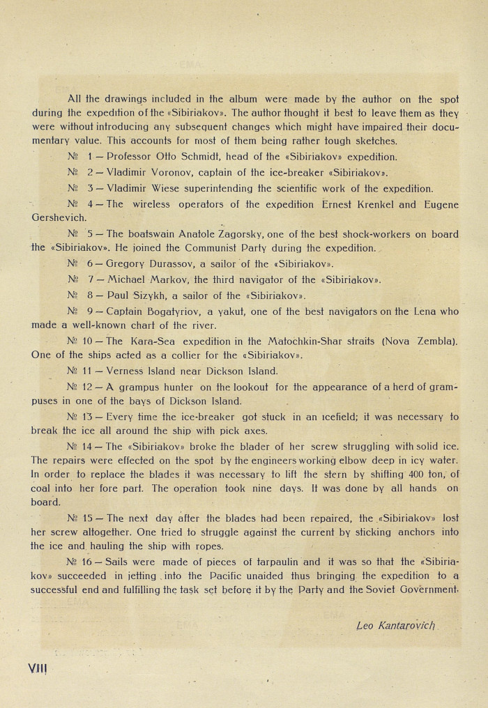 All the drawings included in the album were made by the author on the spot during the expedition of the «Sibiriakov». The author thought it best to leave them as they were without introducing any subsequent changes which might have impaired their documentary value. This accounts for most of them being rather tough sketches.