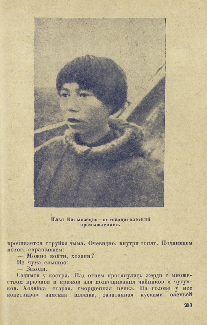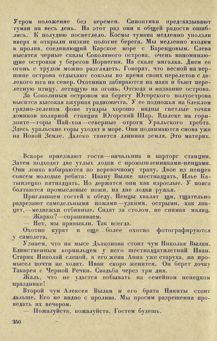 Вскоре приезжают гости — начальник и парторг станции. Затем подходят две утлых лодки с промышленниками-ненцами. Они ловко взбираются по веревочному трапу. Двое из ненцев совсем молодые ребята: Ивану Вылке шестнадцать, Илье Катынзецко пятнадцать. Но держатся они как взрослые. У пояса болтаются промысловые ножи, на дне лодки ружья.