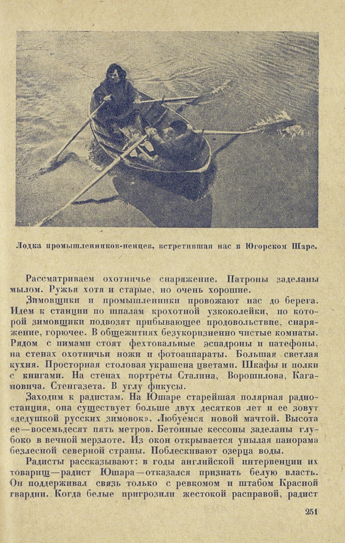 Зимовщики и промышленники провожают нас до берега. Идем к станции но шпалам крохотной узкоколейки, по которой зимовщики подвозят прибывающее продовольствие, снаряжение, горючее. В общежитиях безукоризненно чистые комнаты. Рядом с пимами стоят фехтовальные эспадроны и патефоны, на стенах охотничьи ножи и фотоаппараты. Большая. светлая кухня. Просторная столовая украшена цветами. Шкафы и полки с книгами. На стенах портреты Сталина, Ворошилова, Кагановича. Стенгазета. В углу фикусы.