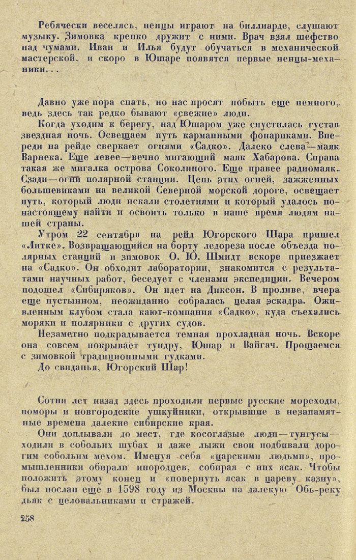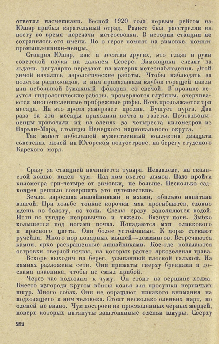 Так живет небольшой мужественный коллектив двадцати советских людей на Югорском полуострове на берегу студеного Карского моря.
