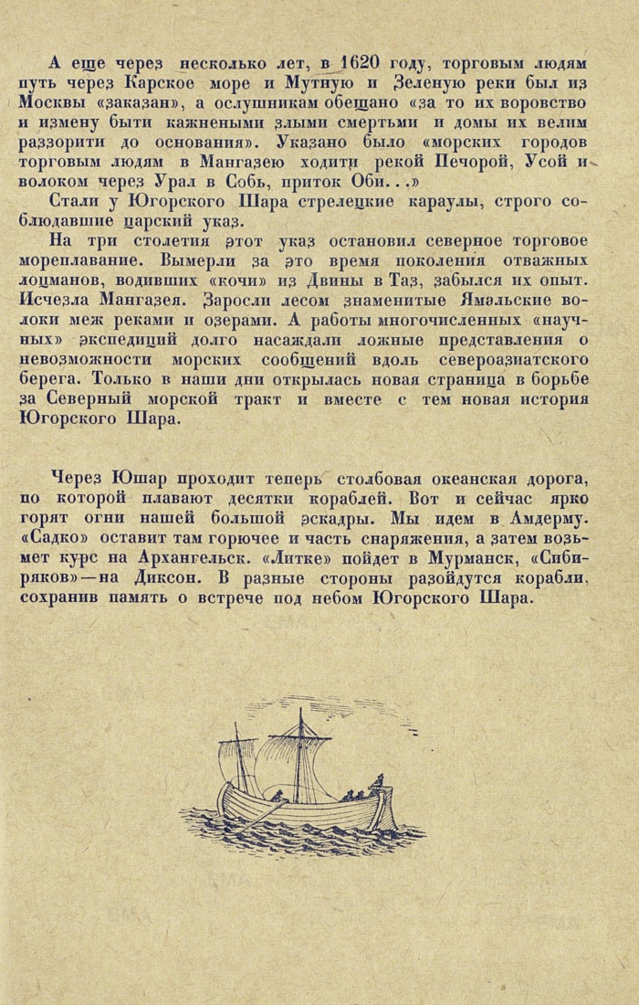 На три столетия этот указ остановил северное торговое мореплавание. Вымерли за это время поколения отважных лоцманов, водивших «кочи» из Двины в Таз, забылся их опыт. Исчезла Мангазея. Заросли лесом знаменитые Ямальские волоки меж реками и озерами. А работы многочисленных «научных» экспедиций долго насаждали ложные представления о невозможности морских сообщений вдоль североазиатского берега. Только в наши дни открылась новая страница в борьбе за Северный морской тракт и вместе с тем новая история Югорского Шара.