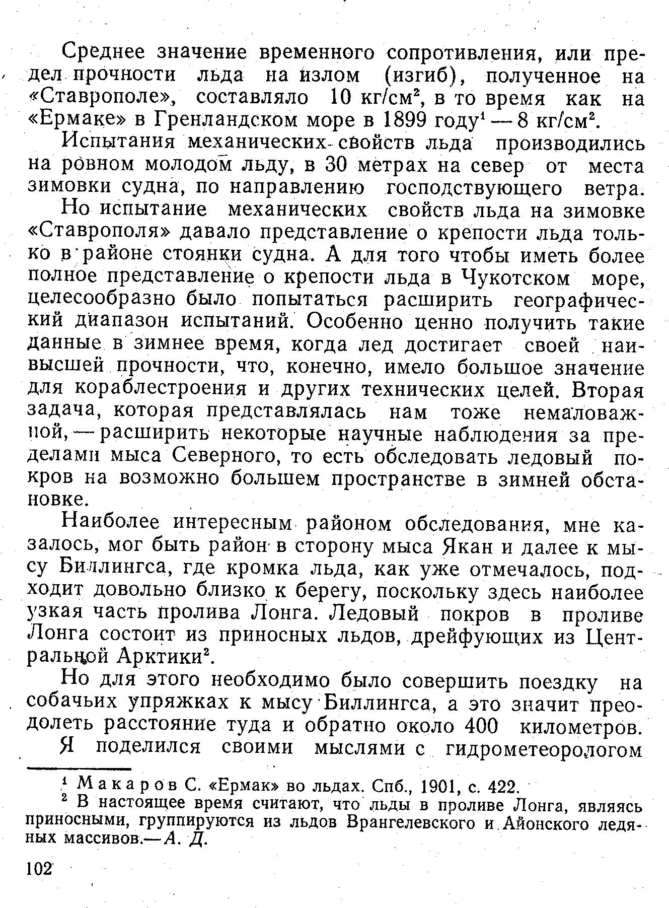 Среднее значение временного сопротивления, или предел прочности льда на излом (изгиб), полученное на «Ставрополе», составляло 10 кг/см2, в то время как на «Ермаке» в Гренландском море в 1899 году {1} — 8 кг/см2.
