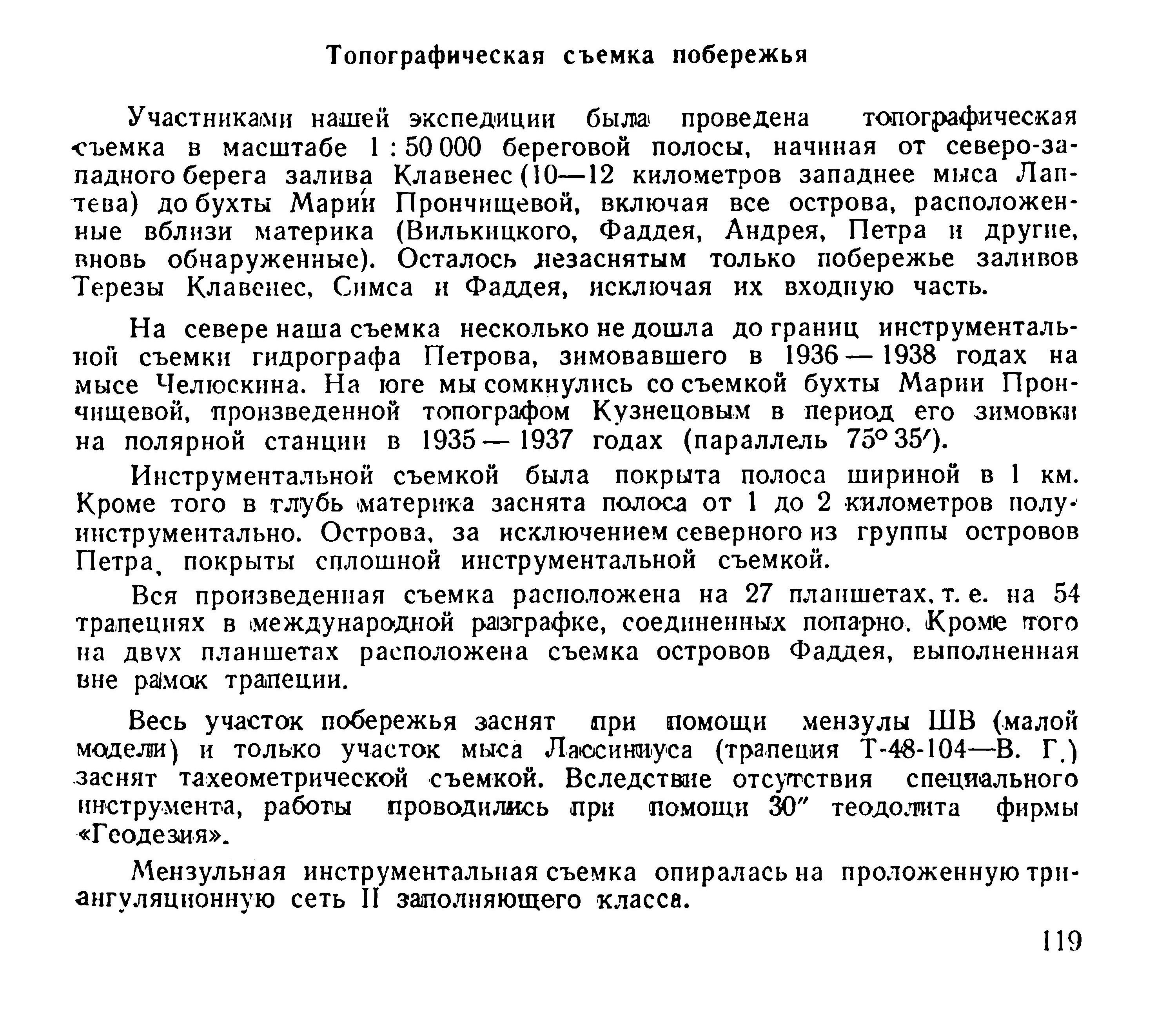 Участниками нашей экспедиции была проведена топографическая съемка в масштабе 1: 50 000 береговой полосы, начиная от северо-западного берега залива Клавенес (10—12 километров западнее мыса Лаптева) до бухты Марии Прончищевой, включая все острова, расположенные вблизи материка (Вилькицкого, Фаддея, Андрея, Петра и другие, вновь обнаруженные). Осталось незаснятым только побережье заливов Терезы Клавенес, Симса и Фаддея, исключая их входную часть.