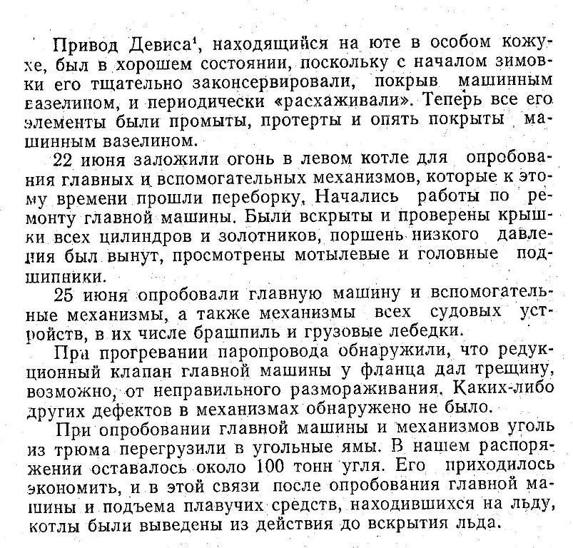 При опробовании главной машины и механизмов уголь из трюма перегрузили в угольные ямы. В нашем распоряжении оставалось около 100 тонн угля. Его приходилось экономить, и в этой связи после опробования главной машины и подъема плавучих средств, находившихся на льду, котлы были выведены из действия до вскрытия льда.