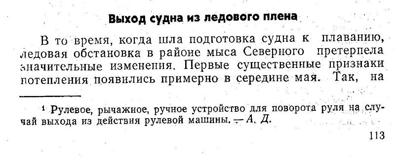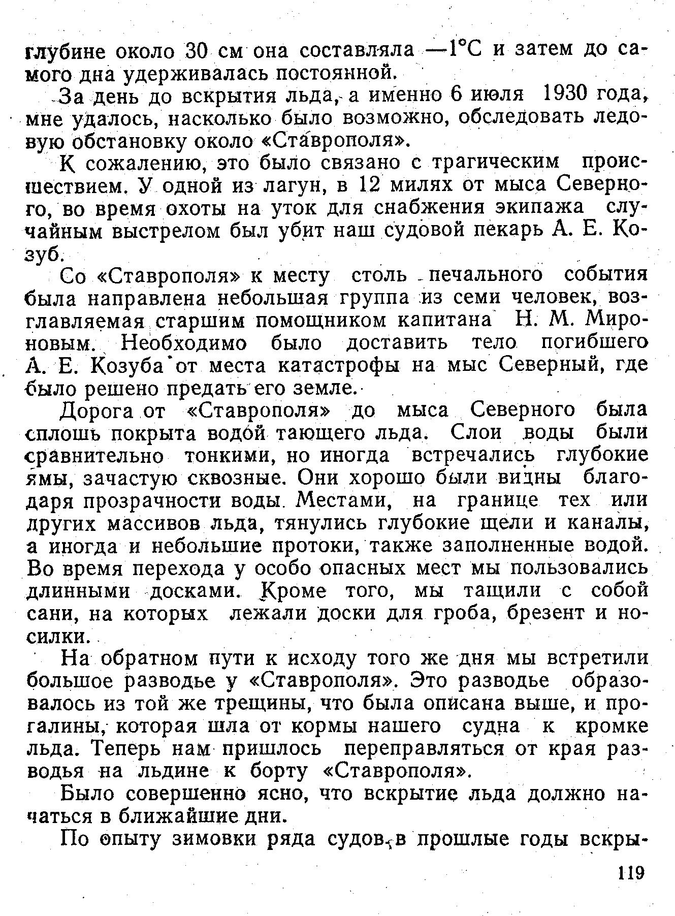 Вскрытие льда у «Ставрополя» произошло 7 июля 1930 года. В моем дневнике по этому поводу записано: «Сегодня первые передвижки льдов. Это началось так: в 8 часов 40 минут у правого борта послышался треск льда и шум пенящейся воды. Одновременно судно немного накренилось сначала на левый, потом на правый борт. У правого борта обломалась льдина вдоль по всей длине».