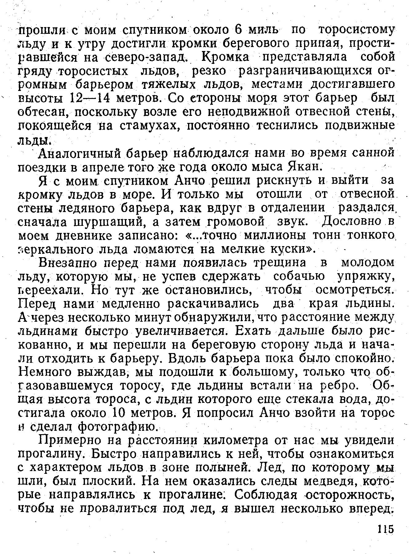прошли с моим спутником около 6 миль по торосистому льду и к утру достигли кромки берегового припая, простиравшейся на северо-запад. Кромка представляла собой гряду торосистых льдов, резко разграничивающихся огромным барьером тяжелых льдов, местами достигавшего высоты 12—14 метров. Со стороны моря этот барьер был обтесан, поскольку возле его неподвижной отвесной стены, покоящейся На стамухах, постоянно теснились подвижные льды.