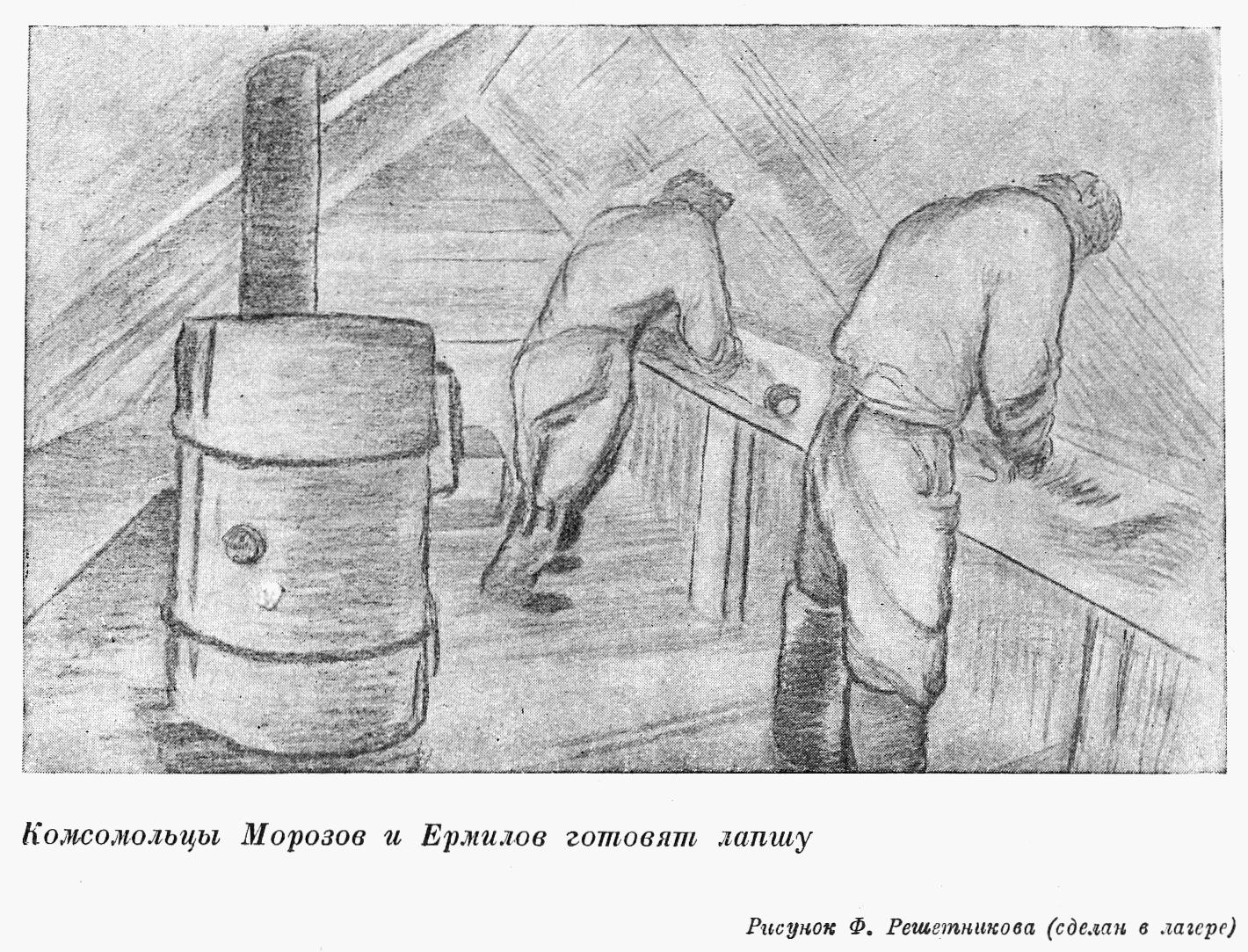 Комсомольцев расставляли на самые ответственные участки работы. Было время, когда важнейшей задачей было валяние лапши из муки и выпечка лепешек. Да, да, комсомольский долг — валяние лапши! На эту работу ставили комсомольцев, ибо вкусную лапшу и хорошие лепешки надо было сделать в плохих условиях. Было трудно. Печь была мала. В небольшой духовке нужно было быстро выпечь муку, полузамерзшую, всплывающую из майны. Мука оттаивала, и на ней создавалась испорченная корка. Мы, правда, имели галеты, но нужна была смена питания. Лагерю нужна была лепешка!