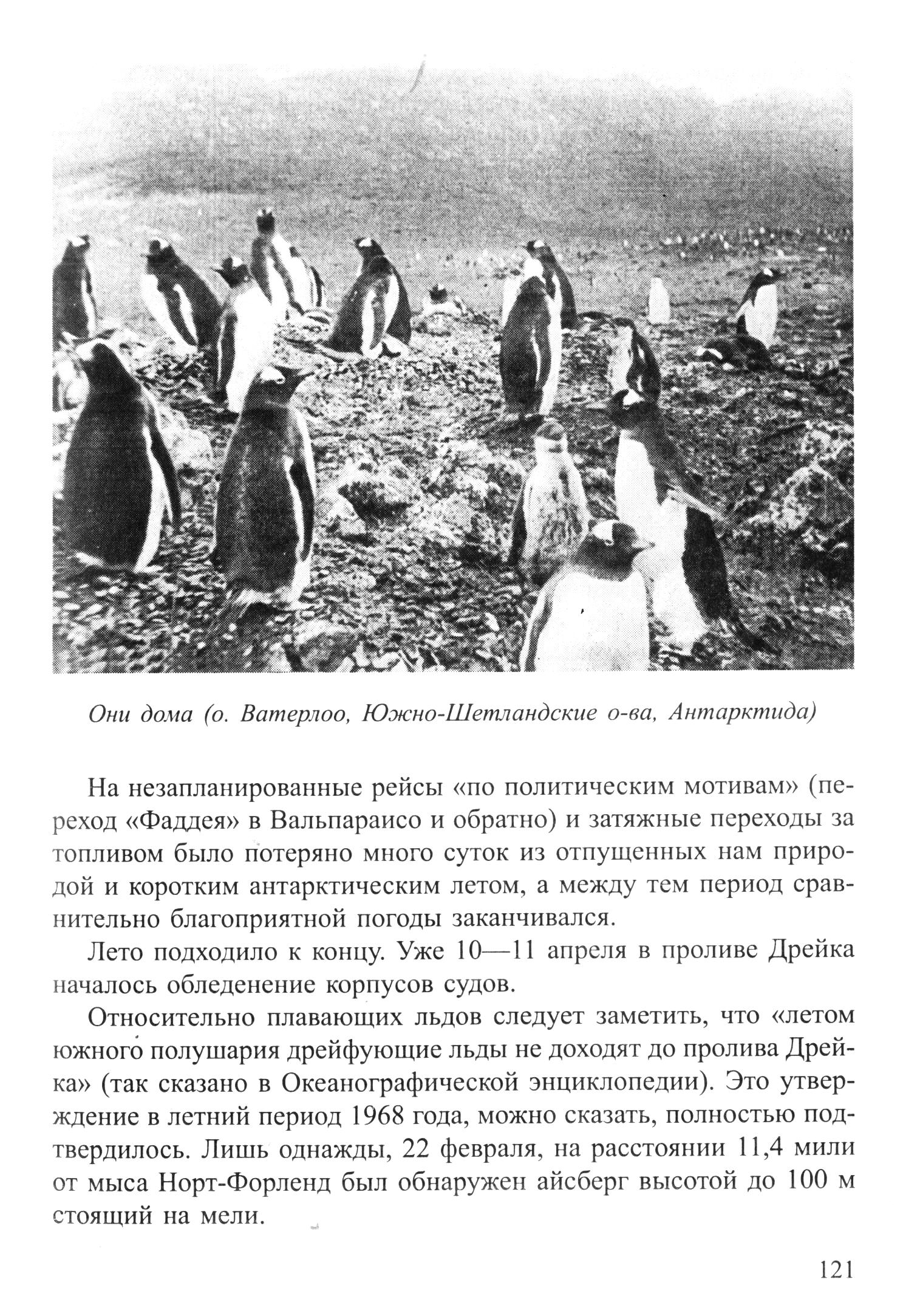 Они дома (о. Ватерлоо, Южно-Шетландские о-ва, Антарктида)На незапланированные рейсы «по политическим мотивам» (переход «Фаддея» в Вальпараисо и обратно) и затяжные переходы за топливом было потеряно много суток из отпущенных нам природой и коротким антарктическим летом, а между тем период сравнительно благоприятной погоды заканчивался.