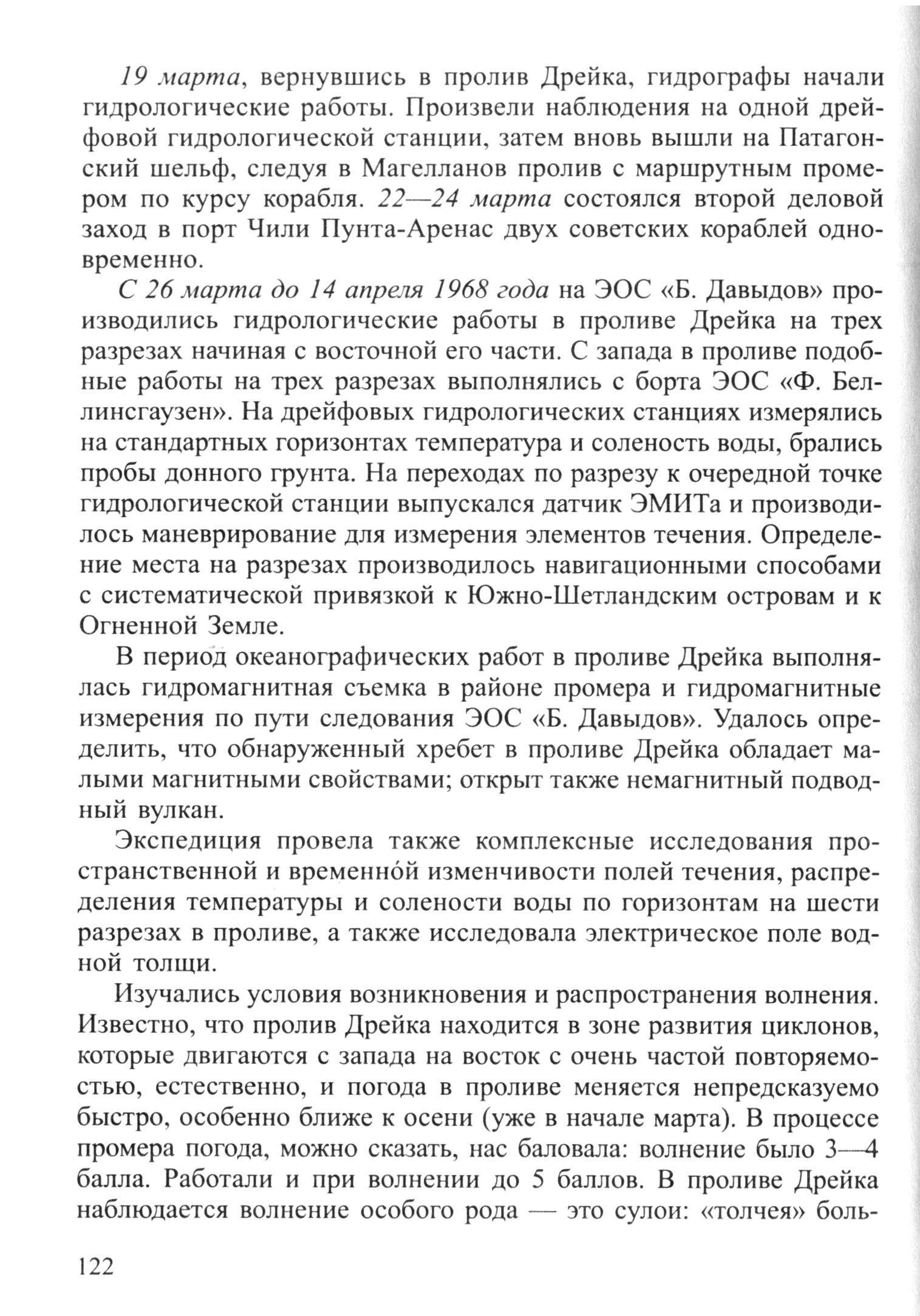 С 26 марта до 14 апреля 1968 года на ЭОС «Б. Давыдов» производились гидрологические работы в проливе Дрейка на трех разрезах начиная с восточной его части. С запада в проливе подобные работы на трех разрезах выполнялись с борта ЭОС «Ф. Беллинсгаузен». На дрейфовых гидрологических станциях измерялись на стандартных горизонтах температура и соленость воды, брались пробы донного грунта. На переходах по разрезу к очередной точке гидрологической станции выпускался датчик ЭМИТа и производилось маневрирование для измерения элементов течения. Определение места на разрезах производилось навигационными способами с систематической привязкой к Южно-Шетландским островам и к Огненной Земле.