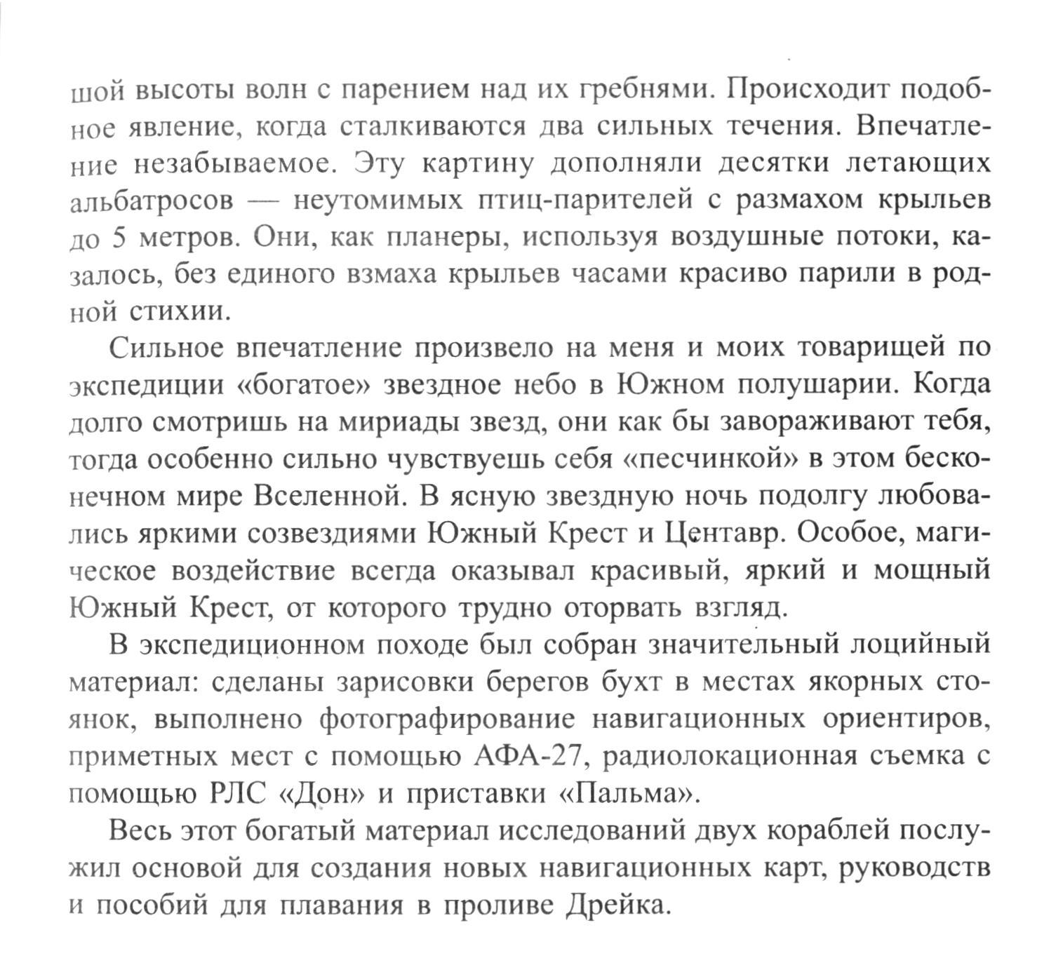 шой высоты волн с парением над их гребнями. Происходит подобное явление, когда сталкиваются два сильных течения. Впечатление незабываемое. Эту картину дополняли десятки летающих альбатросов — неутомимых птиц-парителей с размахом крыльев до 5 метров. Они, как планеры, используя воздушные потоки, казалось, без единого взмаха крыльев часами красиво парили в родной стихии.