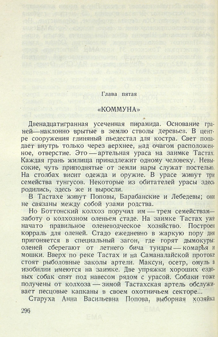 Но Боттонский колхоз поручил им — трем семействам — заботу о колхозном оленьем стаде. На заимке Тастах уже начато правильное оленеводческое хозяйство. Построен корраль для оленей. Стадо ежедневно в жаркую пору дня пригоняется в специальный загон, где горят дымокуры: оленей сберегают от летнего бича тундры — комарья и мошки. Вверх по реке Тастах и на Саманалайской протоке стоят рыболовные заколы артели. Максун, осетр, омуль в изобилии имеются на заимке. Две упряжки хороших ездовых собак опят под навесом рядом с урасой. Собаки тоже получены от колхоза — зимой Тастахская артель обслуживает песцовые капканы в своем охотничьем секторе...