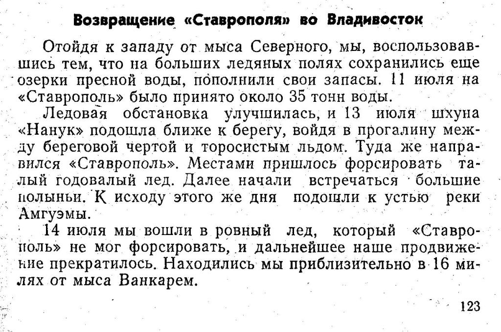 14 июля мы вошли в ровный лед, который «Ставрополь» не мог форсировать, и дальнейшее наше продвижение прекратилось. Находились мы приблизительно в 16 милях от мыса Ванкарем.