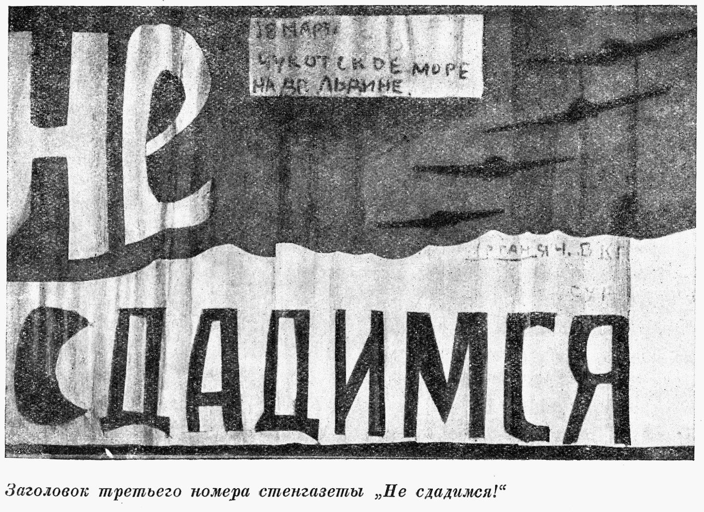 Много думали над заголовком газеты, выпускаемой на дрейфующей льдине. Хотелось в заголовке выразить нашу волю к победе и вместе с тем дать заголовок короткий, ударный, легко запоминающийся. И мы назвали газету "Не сдадимся!"