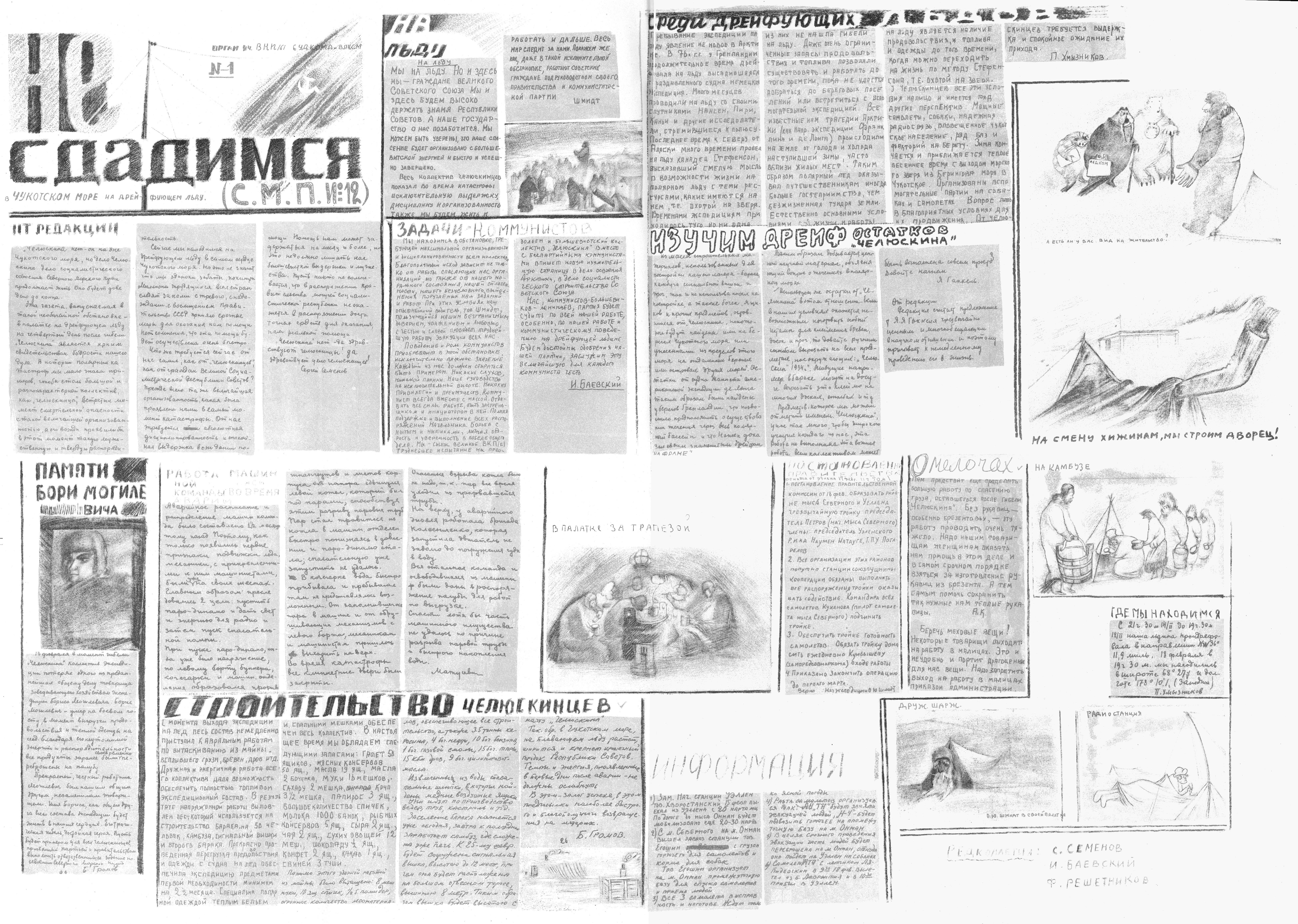 Исключительное значение для всех нас, челюскинцев, имела эта своеобразная газета "Не сдадимся!" Она являлась мощным средством сплочения и консолидации всего коллектива. И статьями, и рисунками, и регулярной периодичностью своего выхода она вливала бодрость и уверенность в то, что наше положение не так тяжело и опасно, что мы спокойно и уверенно можем ждать наступления дней, когда прибудут к нам самолеты, так щедро брошенные нашим правительством на помощь.