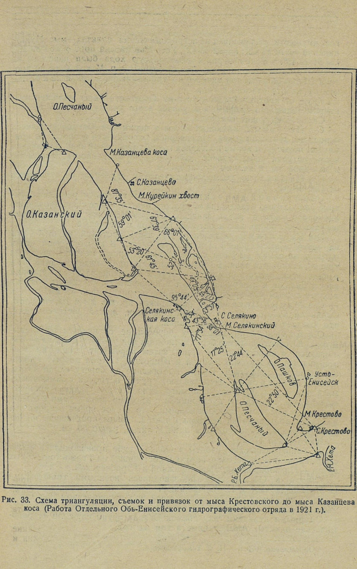 Рис. 33. Схема триангуляции, съемок и привязок от мыса Крестовского до мыса Казанцева коса (Работа Отдельного Обь-Енисейского гидрографического отряда в 1921 г.).