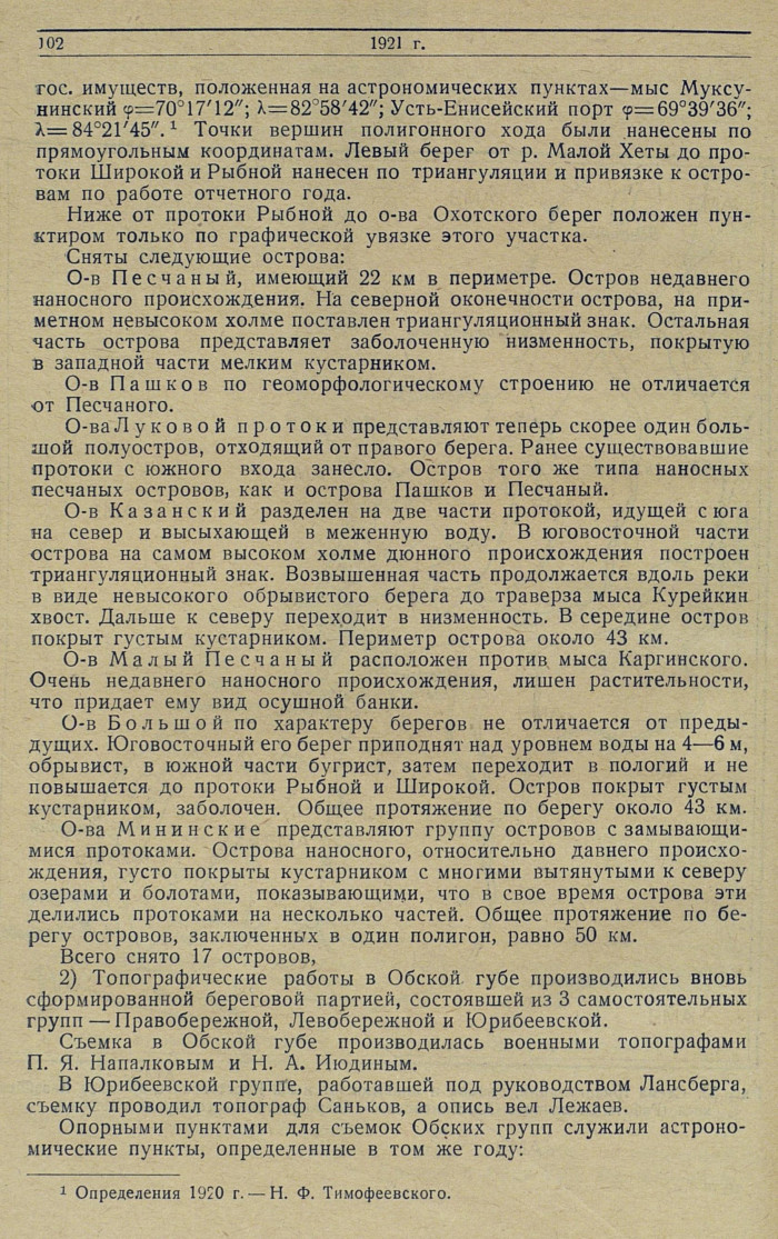 гос. имуществ, положенная на астрономических пунктах — мыс Муксунинский φ=70° 17'12"; λ=82° 58'42"; Усть-Енисейский порт φ=69° 39'36"; λ=84° 21'45".1 Точки вершин полигонного хода были нанесены по прямоугольным координатам. Левый берег от р. Малой Хеты до протоки Широкой и Рыбной нанесен по триангуляции и привязке к островам по работе отчетного года.