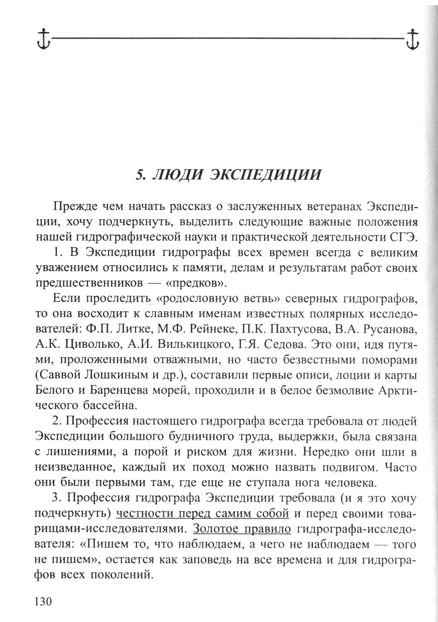 3. Профессия гидрографа Экспедиции требовала (и я это хочу подчеркнуть) честности перед самим собой и перед своими товарищами-исследователями. Золотое правило гидрографа-исследователя: «Пишем то, что наблюдаем, а чего не наблюдаем — того не пишем», остается как заповедь на все времена и для гидрографов всех поколений.