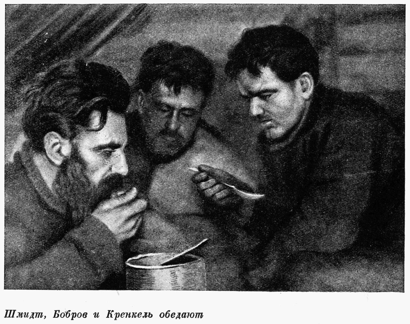 стола. На коленях у Шмидта укладывалась большая фанерная доска, на нее водружались ведерко с супом, галеты или лепешки. Все остальные четыре обитателя усаживались кругом, и трапеза начиналась. "Зачищать" котелок обычно приходилось троим: Эрнесту, Симе и мне. "Старики", как мы звали Отто Юльевича и Алексея Николаевича, ели с аппетитом, но, как нам казалось, очень мало.