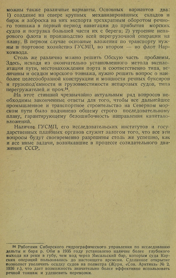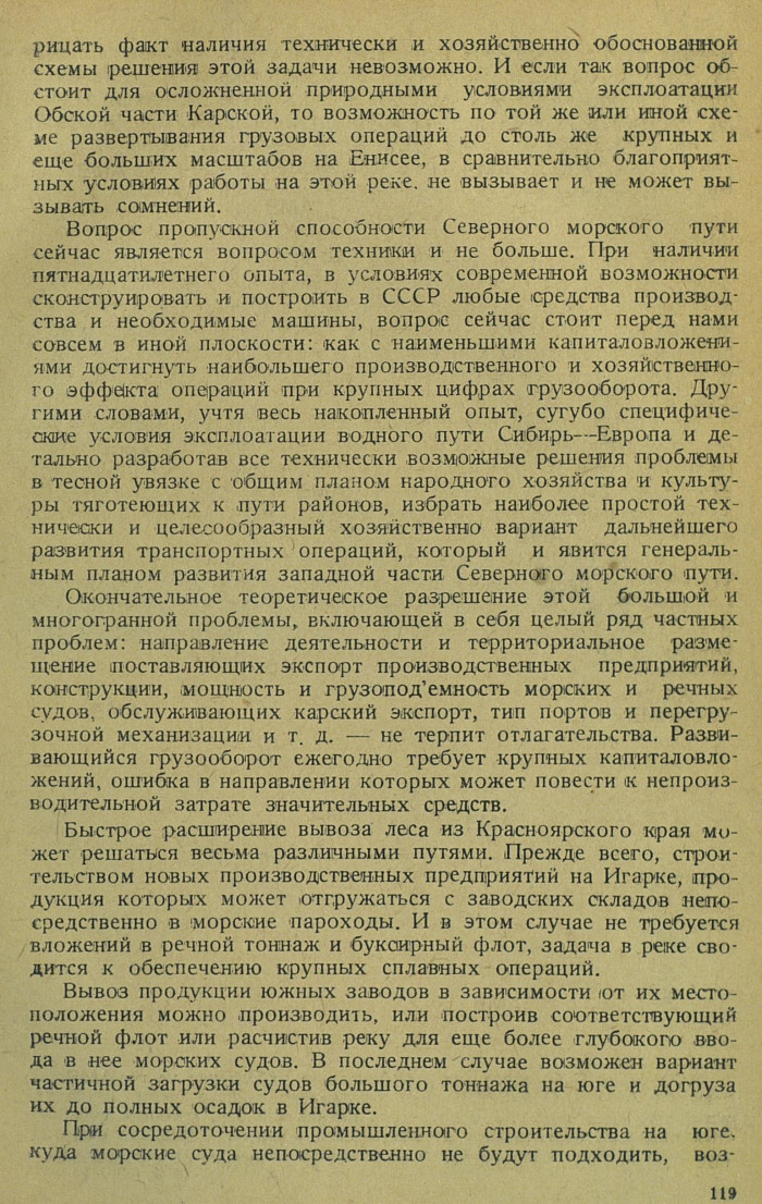 Вопрос пропускной способности Северного морского пути сейчас является вопросом техники и не больше. При наличии пятнадцатилетнего опыта, в условиях современной возможности сконструировать и построить в СССР любые средства производства и необходимые машины, вопрос сейчас стоит перед нами совсем в иной плоскости: как с наименьшими капиталовложениями достигнуть наибольшего производственного и хозяйственного эффекта операций при крупных цифрах грузооборота. Другими словами, учтя весь накопленный опыт, сугубо специфические условия эксплоатации водного пути Сибирь—Европа и детально разработав все технически возможные решения проблемы в тесной увязке с общим планом народного хозяйства и культуры тяготеющих к пути районов, избрать наиболее простой технически и целесообразный хозяйственно вариант дальнейшего развития транспортных операций, который и явится генеральным планом развития западной части Северного морского пути.