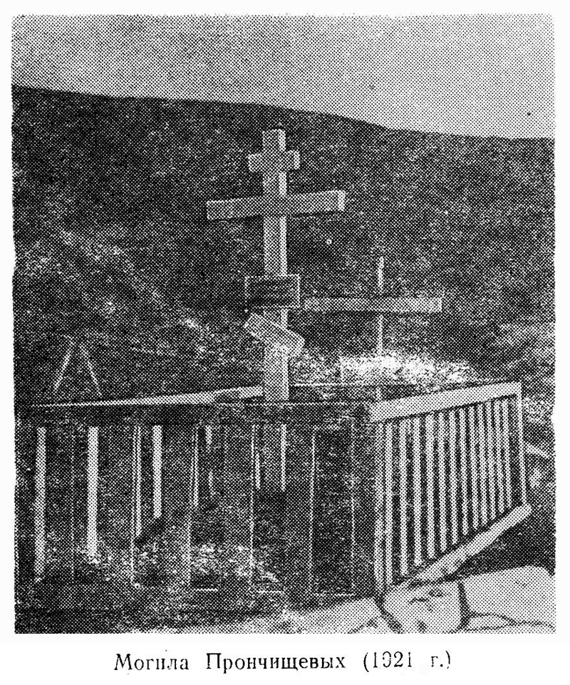 А. Л. Чекановский 26 августа 1875 года нашел на этом месте «две жалких, почерневших, лишаями поросших гробницы», нам думается установленных Ильиным. «Малый, невзрачный, извыветрившийся, но не изгнивший крест без перекладины, стоит одинокий, как столб на могиле самоубийцы. Следы надписи на нем еще приметны, да и предание на устах у жителей. Это — могила злополучного Прончищева и неустрашимой жены его», — утверждает Чекановский»***.