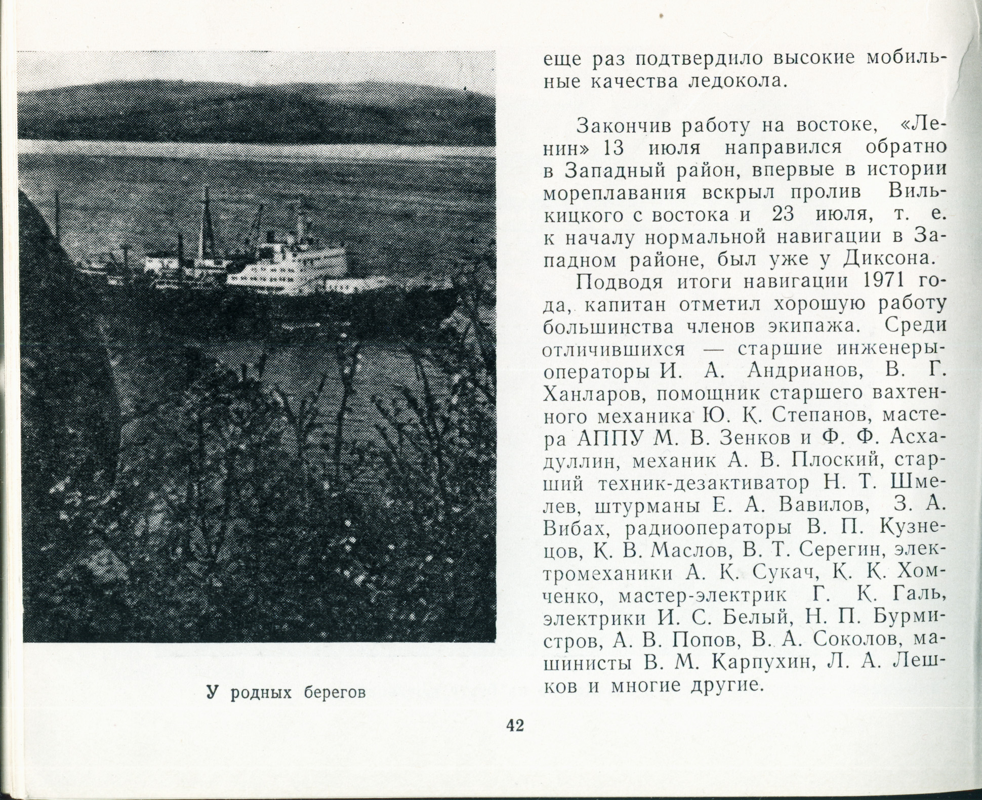 Подводя итоги навигации 1971 года, капитан отметил хорошую работу большинства членов экипажа. Среди отличившихся - старшие инженеры-операторы И. А. Андрианов, В. Г. Ханларов, помощник старшего вахтенного механика Ю. К. Степанов, мастера АППУ М. В. Зенков и Ф. Ф. Асхадуллин, механик А. В. Плоский, старший техник-дезактиватор Н. Т. Шмелев, штурманы Е. А. Вавилов, 3. А. Вибах, радиооператоры В. П. Кузнецов, К. В. Маслов, В. Т. Серегин, электромеханики А. К. Сукач, К. К. Хомченко, мастер-электрик Г. К. Галь, электрики И. С. Белый, Н. П. Бурмистров, А. В. Попов, В. А. Соколов, машинисты В. М. Карпухин, Л. А. Лешков и многие другие.