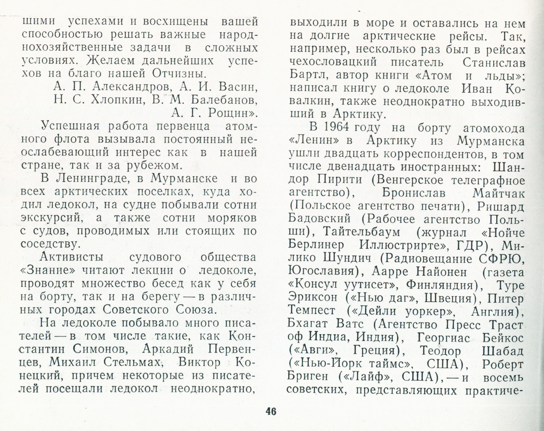 В 1964 году на борту атомохода «Ленин» в Арктику из Мурманска ушли двадцать корреспондентов, в том числе двенадцать иностранных: Шандор Пирити (Венгерское телеграфное агентство), Бронислав Майтчак (Польское агентство печати), Ришард Бадовский (Рабочее агентство Польши), Тайтельбаум (журнал «Нойче Берлинер Иллюстрирте», ГДР), Милико Шундич (Радиовещание СФРЮ, Югославия), Аарре Найонен (газета «Консул уутисет», Финляндия), Туре Эриксон («Нью даг», Швеция), Питер Темпест («Дейли уоркер», Англия), Бхагат Вате (Агентство Пресс Траст оф Индиа, Индия), Георгиас Бейкос («Авги», Греция), Теодор Шабад («Нью-Йорк тайме», США), Роберт Бриген («Лайф», США), - и восемь советских, представляющих практически всю центральную прессу СССР: В. Головачев («Правда»), В. Кондратьев («Известия»), В. Чертков («Труд»), П. Барышев (АПН), М. Альперт (АПН), Г. Величко (телевидение), А. Сериков («Огонек»), В. Богачев (ТАСС).