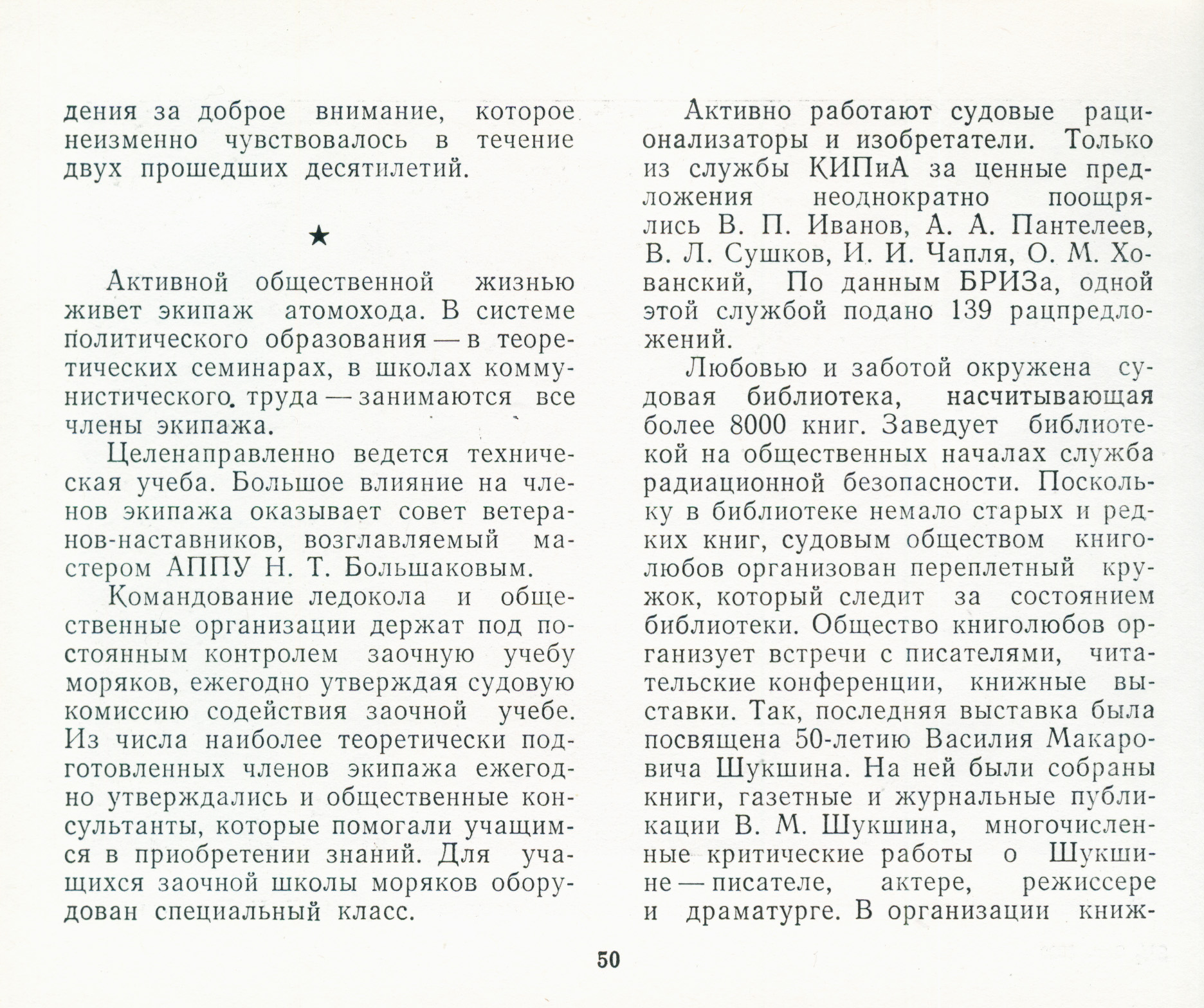 Любовью и заботой окружена судовая библиотека, насчитывающая более 8000 книг. Заведует библиотекой на общественных началах служба радиационной безопасности. Поскольку в библиотеке немало старых и редких книг, судовым обществом книголюбов организован переплетный кружок, который следит за состоянием библиотеки. Общество книголюбов организует встречи с писателями, читательские конференции, книжные выставки. Так, последняя выставка была посвящена 50-летию Василия Макаровича Шукшина. На ней были собраны книги, газетные и журнальные публикации В. М. Шукшина, многочисленные критические работы о Шукшине-писателе, актере, режиссере и драматурге. В организации книжных выставок - большая заслуга заботливых хозяев библиотеки В. В. Ишина, О. С. Пиканорова, М. П. Филиппова, руководителей общества книголюбов Г. К. Галя, В. А. Коротича. На ледоколе постоянно работает кабинет политпросвещения.