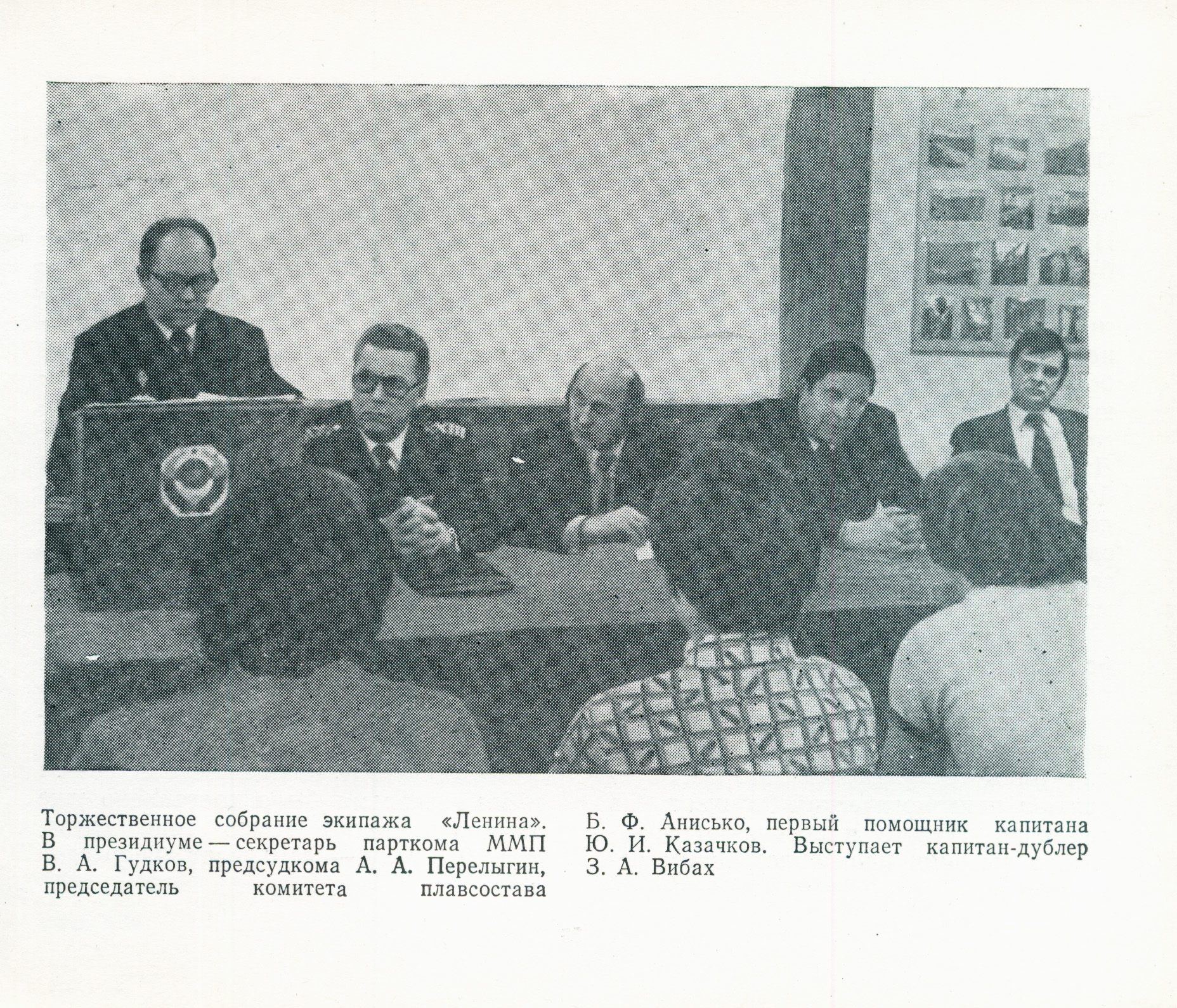 По этому случаю на ледоколе состоялся митинг. На нем выступили первый помощник капитана В. А. Гудков, начальник Мурманского морского пароходства В. А. Игнатюк, капитан-дублер В. К. Кочетков, мастер АППУ В. А. Мантула, главный инженер-механик И. К. Мочешников. В этот же знаменательный, радостный для экипажа «Ленина» день была получена телеграмма: