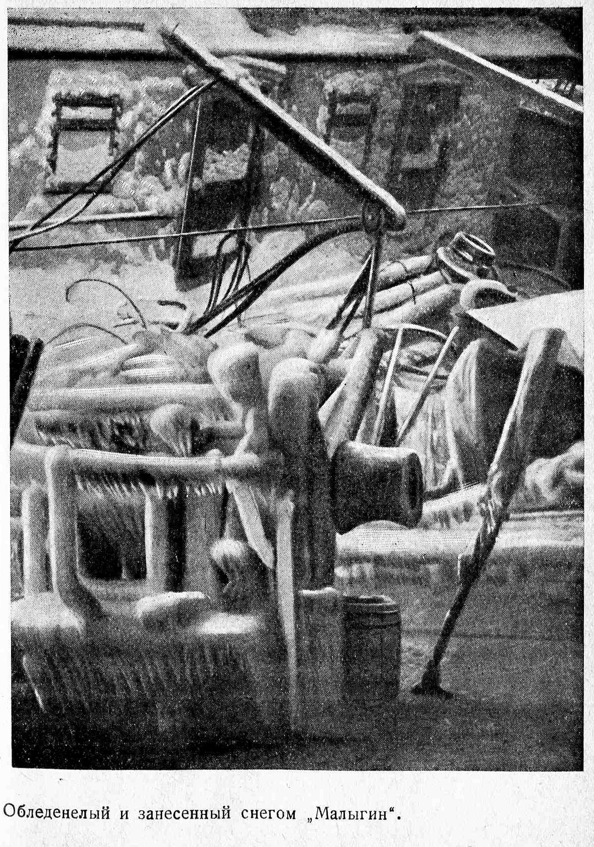 В зал вошел Филатов, поглядел, вынул трубку и тотчас вышел обратно на улицу. Мой сосед, посмотрев вслед ушедшему Филатову, сказал под гром радиолы: — Я был на «Малыгине». Страшно вспомнить. Нет, для нас не было никакой опасности. Нас, пассажиров, как детей, усадили в шлюпки и привезли на берег. Страшно вспомнить фигуру капитана... Шлюпки отчаливали от борта ледокола, мы, удаляясь от него, смотрели и видели: «Малыгин» медленно погружался в воду... Ушла под воду нижняя палуба. Капитан поднялся наверх, и долго был виден силуэт одинокого человека. Страшно вспомнить... Медленно гасли огни на «Малыгине», качнулась груда и... темнота.