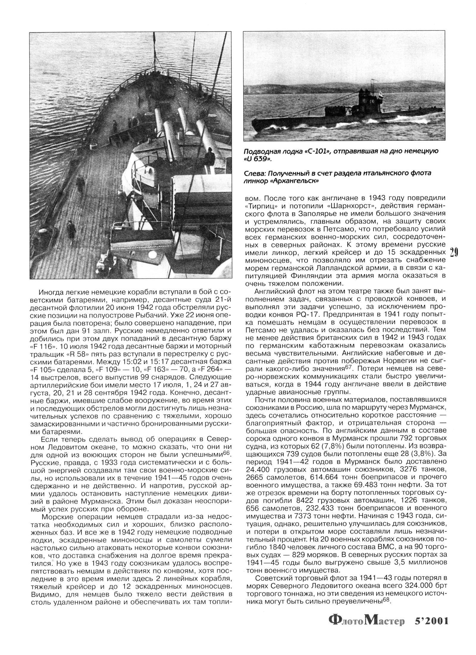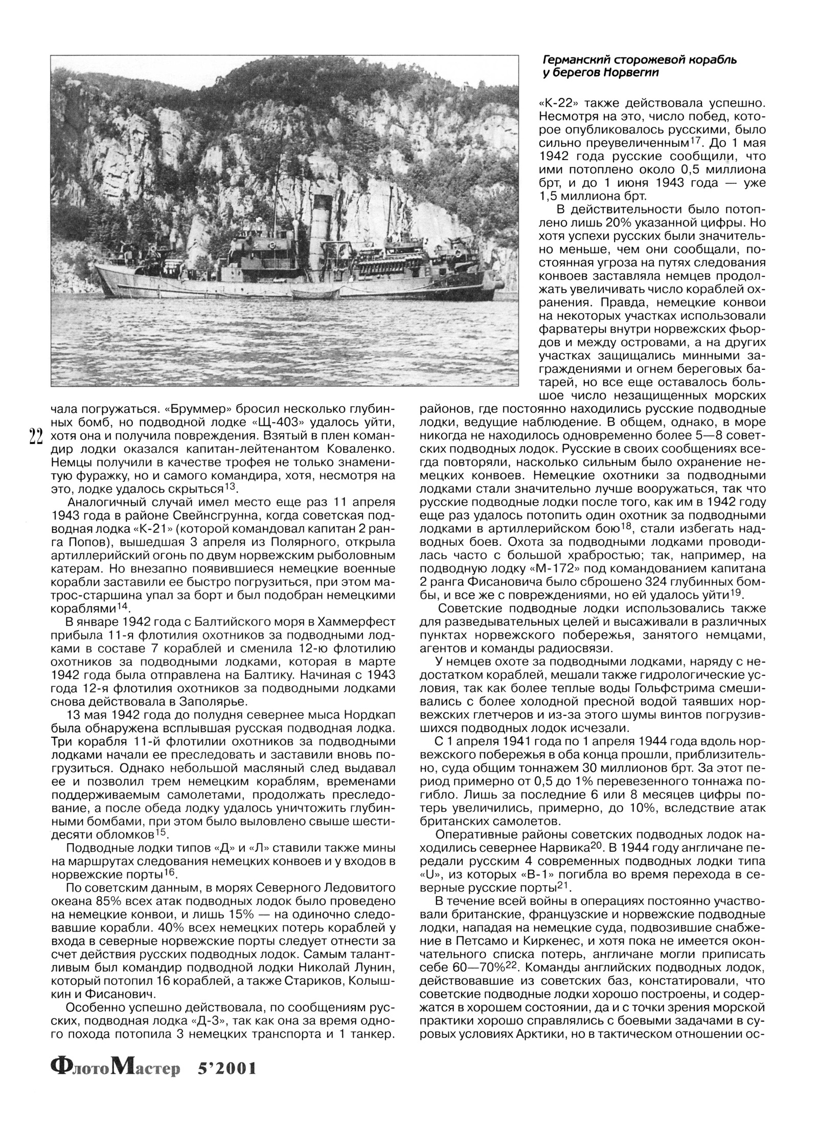 В действительности было потоплено лишь 20% указанной цифры. Но хотя успехи русских были значительно меньше, чем они сообщали, постоянная угроза на путях следования конвоев заставляла немцев продолжать увеличивать число кораблей охранения. Правда, немецкие конвои на некоторых участках использовали фарватеры внутри норвежских фьордов и между островами, а на других участках защищались минными заграждениями и огнем береговых батарей, но все еще оставалось большое число незащищенных морских районов, где постоянно находились русские подводные лодки, ведущие наблюдение. В общем, однако, в море никогда не находилось одновременно более 5—8 советских подводных лодок. Русские в своих сообщениях всегда повторяли, насколько сильным было охранение немецких конвоев. Немецкие охотники за подводными лодками стали значительно лучше вооружаться, так что русские подводные лодки после того, как им в 1942 году еще раз удалось потопить один охотник за подводными лодками в артиллерийском бою