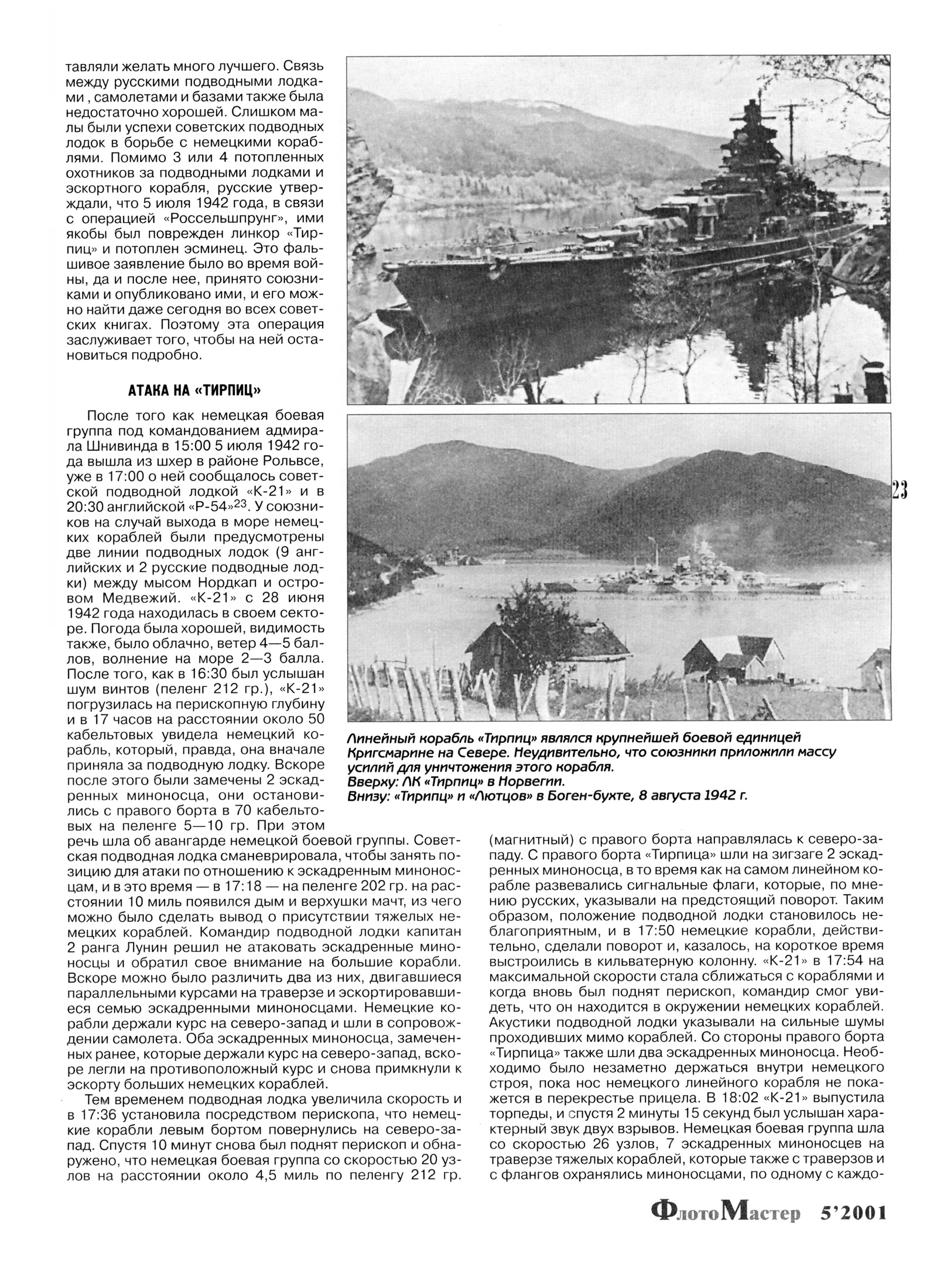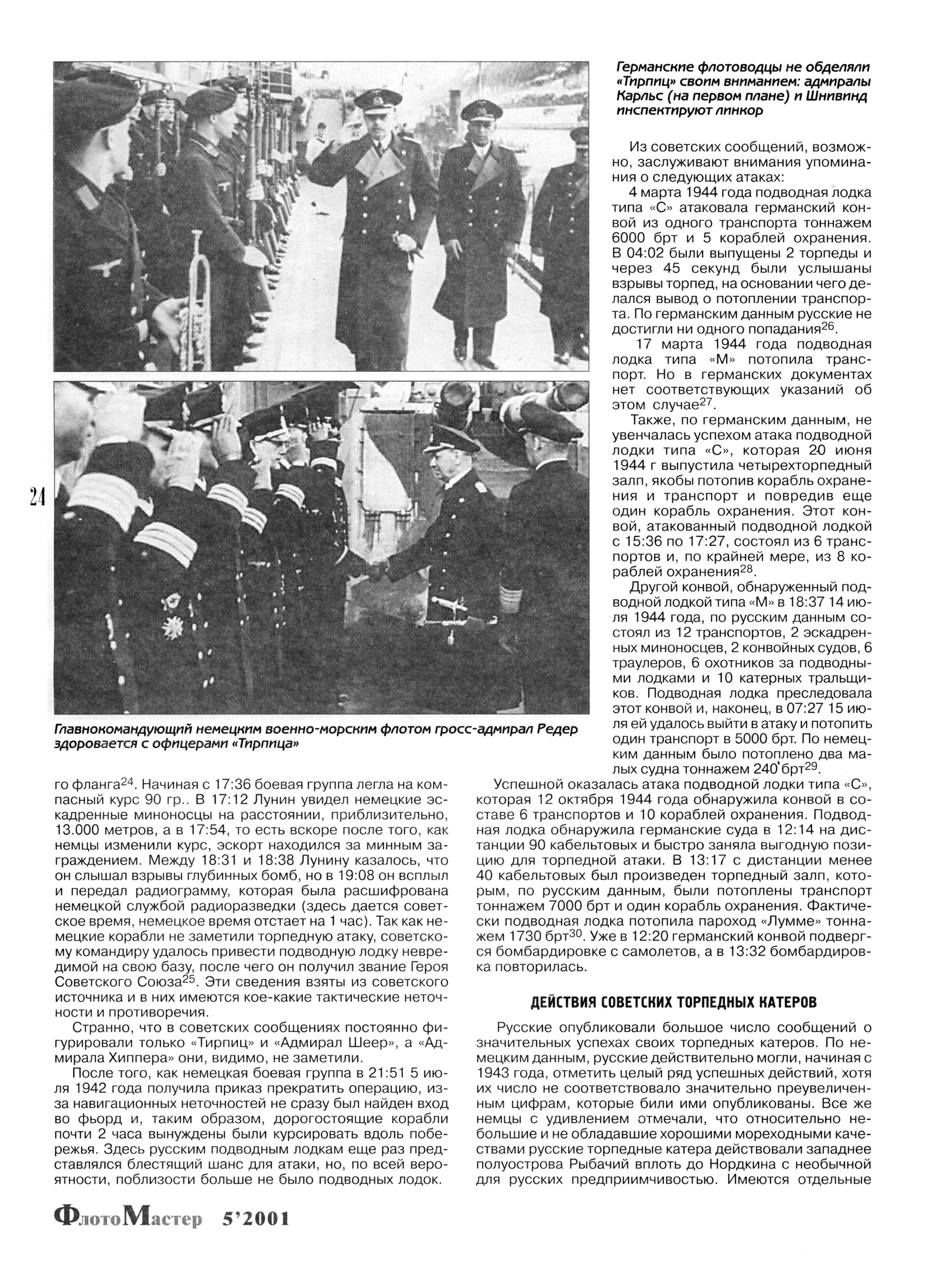 АТАКА НА «ТИРПИЦ»После того как немецкая боевая группа под командованием адмирала Шнивинда в 15:00 5 июля 1942 года вышла из шхер в районе Рольвсе, уже в 17:00 о ней сообщалось советской подводной лодкой «К-21» и в 20:30 английской «Р-54»