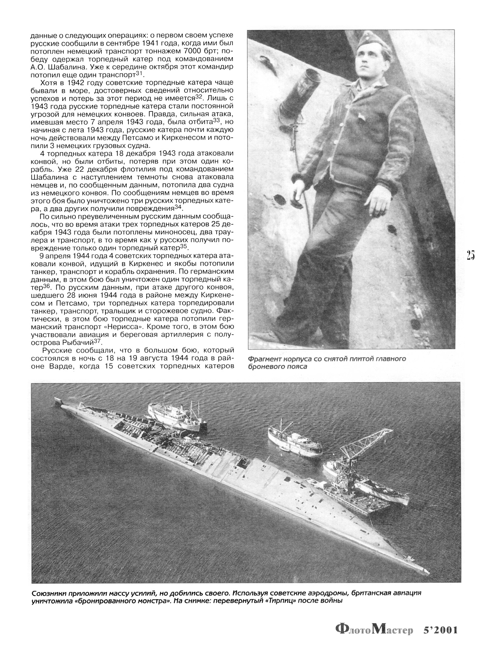 ДЕЙСТВИЯ СОВЕТСКИХ ТОРПЕДНЫХ КАТЕРОВРусские опубликовали большое число сообщений о значительных успехах своих торпедных катеров. По немецким данным, русские действительно могли, начиная с 1943 года, отметить целый ряд успешных действий, хотя их число не соответствовало значительно преувеличенным цифрам, которые били ими опубликованы. Все же немцы с удивлением отмечали, что относительно небольшие и не обладавшие хорошими мореходными качествами русские торпедные катера действовали западнее полуострова Рыбачий вплоть до Нордкина с необычной для русских предприимчивостью. Имеются отдельные данные о следующих операциях: о первом своем успехе русские сообщили в сентябре 1941 года, когда ими был потоплен немецкий транспорт тоннажем 7000 брт; победу одержал торпедный катер под командованием А.О. Шабалина. Уже к середине октября этот командир потопил еще один транспорт